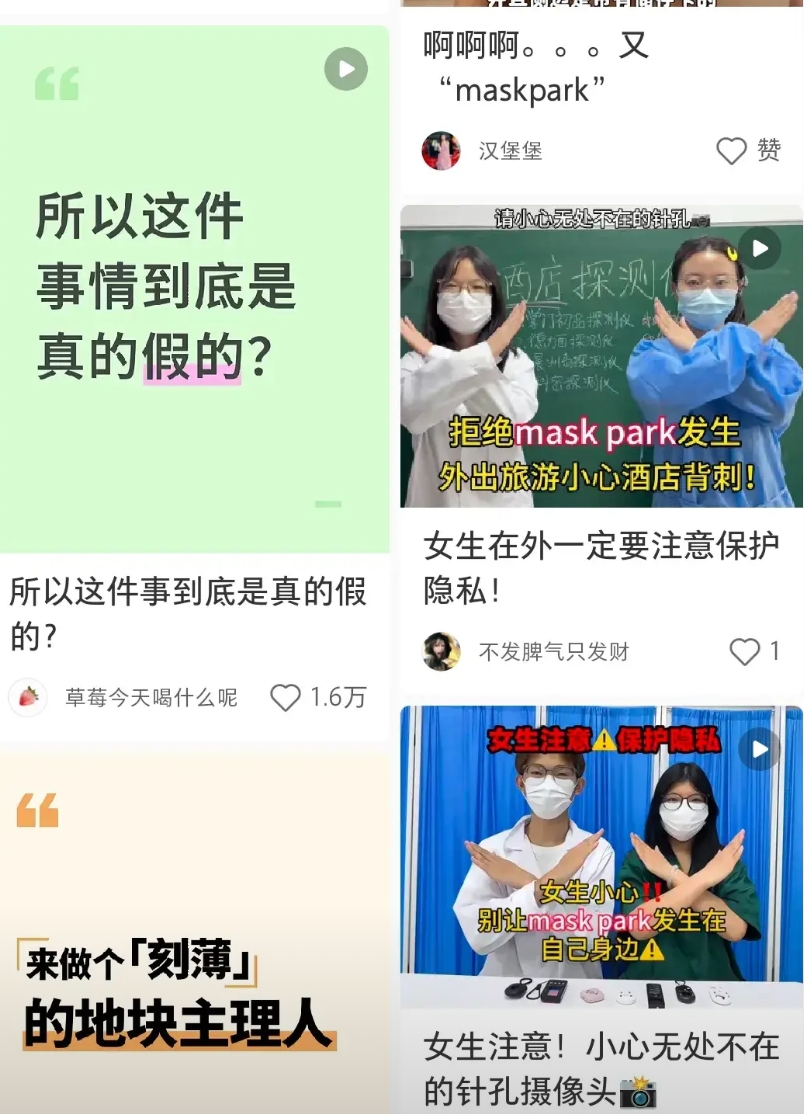 统一手势,统一背景音乐,统一戴口罩不敢真面目示人,统一时间,集体造媱maskpark有十万中国男人偷拍并集体差不多同一时间发文造势并打拳。真团结,就这样还说没组织我是不信的