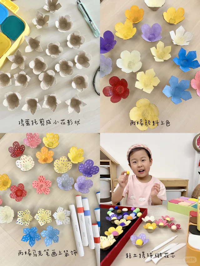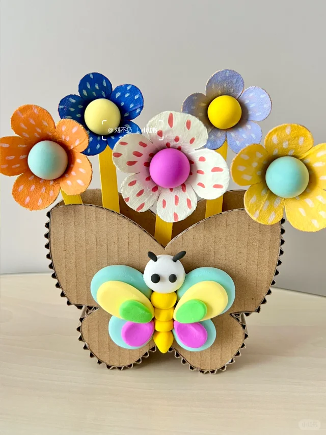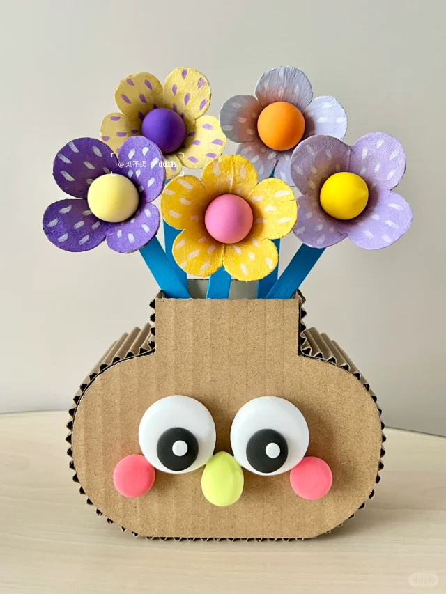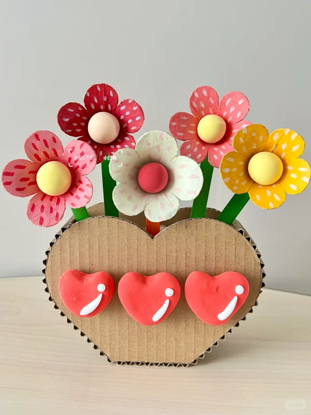 鸡蛋托不要扔❗️ 搭配纸板和粘士做美丽的花花🌸🌼小盆栽~ 先将快递箱纸板裁出两个一样的小花盆形状. 大家可以选择自己喜欢的图案哦~ 侧面用瓦楞纸条封边,用热熔胶更牢固! 这样小花盆就做好啦,用粘土捏一些自己喜欢的 图案装饰~ 鸡蛋托剪成花花形状,丙烯颜料上色,晾干后用丙烯马克笔画出装饰,简单的小点点就很出效果! 用粘土搓成小球做花芯,粘在雪糕棍上就可以啦! 插在做好的花盆里,美腻的花花小盆栽搞定[派对R][派对R][派对R]