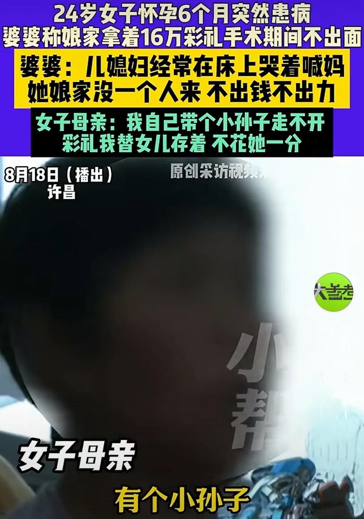 河南许昌,24岁女子与丈夫认识不到一年就结婚,当时已怀孕3个月,可3个月后,女子突然患病,连医院都查不出病因。婆家给女子治病花了7-8万。连7个月胎儿都未保住。女子在病床上哭着喊妈,可娘家人一个都不来,既不出钱也不出力!婆婆说:彩礼16万娘家一下子全拿走了,一分也不给。娘家妈说:自己在看孙子走不开,彩礼替女儿存着呢,不花她一分钱。 据大参考8月18日报道,贺女士看着病床上哭着喊妈的儿媳,很是心疼,她想不明白,当妈的咋这么狠心?她可是亲闺女啊! 贺女士儿子小伟与小芳自由恋爱,认识不到一年,贺女士得知小芳已怀孕近3个月了,高兴坏了,她赶紧张罗着操办婚礼。这可是双喜临门的好事! 2024年4月,小伟与小芳举办了隆重的婚礼,彩礼都是当地最高的数额16万。 可彩礼钱一给付,就被亲家母拿走了,当时,贺女士心想,可能当妈的怕年轻人乱花钱帮她保管,等孩子有个为难遭灾再拿出来。 媳妇娶进门,贺女士就等着抱大孙子,三世同堂其乐融融,共享天伦之乐了! 然而,不幸突然降临。 7月时小芳怀孕6个月,她突然手抖擞咬牙,全家人吓坏了,把她送进医院。 医生也不知是啥原因,查不出是啥病,并且还说她肚中胎儿保不住。 8月时,全家人万分不舍,同意将近7个月的胎儿做了引 产手术。 贺女士心心念念的大孙子没了,非常难过,可为了给儿媳治病,这也是没办法。 小芳病痛的折磨加上失去孩子的手术,让她更加痛苦,可她娘家人一个都不来看她。 她躺在床上哭着喊妈,俺娘真狠心呐,都不来看我!婆婆看她这样也心疼,不知怎么安慰她。 给小芳治病里外里都花了7-8万了,贺女士着急了,刚给儿子操办完婚礼,积蓄所剩无几,这眼看着就没钱了,可咋办呢? 自从儿媳住院到做手术,娘家人就跟没事似的,不出钱也不出力,连声问候都没有,真没见过这样娘家! 儿媳的病越发严重,甚至都无法与人正常沟通,只会躺在床上啊、啊叫,她是在叫妈呀! 娘家人不管不问,贺女士很生气,她说不用他家出钱,可彩礼钱16万娘家全拿走,如今小芳生病用钱。他们一分钱都不给。 贺女士无奈找到记者,希望帮她调解:我都花10万了,16万彩礼,她出6万就中,多了我也不要。 记者随贺女士找到小芳母亲,问她女儿生病期间,怎么都不看她去? 小芳母亲说:闺女生病了,我心里啥味啊!是吃不下睡不着啊!可是我有小孙子,走不出去,再说也没出过门! 她还说:女儿16万彩礼在她手里,是帮女儿存着呢,将来全给她,不会花她一分钱! 她说亲家动不动就说我坏良心,她算啥?还说不要我女儿了。 贺女士承认对儿媳说过:你要是以前就这样,俺都不敢要你!这是实话,可儿媳生病,她白天晚上陪着照顾她,为她花钱治病,毫不懈怠,不比你亲娘差? 贺女士说,既然钱你还会给女儿,那她生病需要钱,你就把彩礼钱拿出来。 这可是你亲闺女,别觉得给她治病,治不好怕人财两空,我都不怕你怕啥? 贺女士觉得儿媳最需要亲人的关怀,和筹款给她治疗,她太年轻了,才24岁!还有大把的好时光。 小芳妈妈抹着眼泪说,有空找个车去看女儿,可往出拿不拿彩礼钱,她并未松口。 《民法典》第1062条规定:夫妻关系存续期间所有财产为夫妻的共同财产:(四)继承或者受赠的财产;(五)其他应当归共同所有的财产。夫妻对共同财产,有平等的处理权。 彩礼通常被视为一种附条件的赠与,是以结婚为目的的赠与行为。为对女方个人的赠与。 娘家妈将16万彩礼全部拿走并声称替女儿存着,这种做法虽可能出于保管目的,但从法律和情理角度,在女儿面临重大疾病需要治疗时,娘家有义务将彩礼钱用于女儿的治疗。 《民法典》第1067条规定:父母不履行抚养义务的,未成年子女或者不能独立生活的成年子女,有要求父母给付抚养费的权利。 虽父母对未成年子女或不能独立生活成年子女的抚养义务。 但从亲属间的扶助义务这一广义概念来看,亲属之间在特定情况下负有相互扶助的义务。 小芳年仅24岁,因患病失去胎儿且自身遭受病痛折磨,处于极度困难和需要帮助的状态。 娘家妈从亲属间的扶助义务以及人道主义角度出发,应当拿出部分或全部彩礼用于小芳的治疗。 她以看小孙子走不开以及彩礼替女儿存着将来会给等理由拒绝拿钱,在法律和情理上都难以站得住脚。 《民法典》第6条规定:民事主体从事民事活动,应当遵循公平原则,合理确定各方的权利和义务。 婆家为小芳的治疗花费了7 - 8万,积蓄耗尽,而小芳的病情仍未得到有效控制,需要继续治疗。 婆家要求娘家拿出部分彩礼用于治疗是合理的。 小芳作为婆家和娘家共同的女儿,双方都有责任和义务为她提供必要的治疗支持。 娘家拿出彩礼用于治疗,既符合公平原则,也遵循了公序良俗。 您觉得娘家该不该拿出彩礼钱给女儿治病? (人物为化名) 关注@小栗子看法 一起交流讨论,学习法律知识!