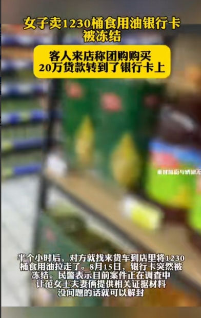河南漯河,女子和丈夫经营的粮油店来了一个大单,一名女子要买1230桶食用油,价值20多万,女子以为做成一笔大生意,结果对方把油拉走后,女子的卡突然被封了,民警告诉女子,对方付给她的20万余元是来源不明的涉案资金。女子崩溃:现在生意根本做不了,银行卡全被封了,货卖出去,钱都收不到!