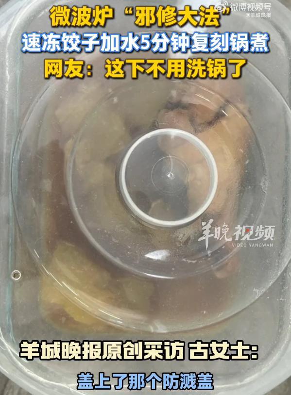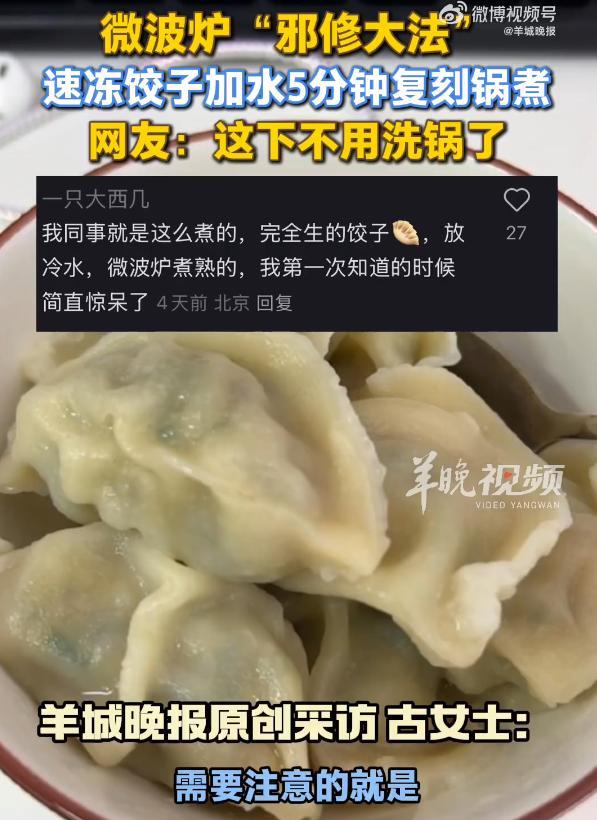 广东广州,女子想要吃饺子,可上班期间又没有煮饺子的条件,于是突发奇想,用公司内的微波炉加热速冻饺子,不料效果却出奇的好,不仅味道完美复刻锅煮,甚至连洗锅的步骤都省了 女子介绍,她平时想在办公室吃饺子,但一想到传统的水煮工序,心里就发怵。要烧水,要盯着锅防止煮破皮,最后还得洗锅洗碗,光是想一想就嫌麻烦。她干脆另辟蹊径,在公司附近买了一袋速冻水饺,饺子往微波炉里一放,还真有意外效果 她的操作其实很简单,把饺子直接放进一个深口瓷碗里,倒一些热水进去,水量大概没过饺子的一半,再盖上一个防溅盖,高火转个五分钟 等到叮的一声,打开盖子,饺子一个个鼓鼓囊囊,馅料烫嘴,外皮柔韧,还带点鲜汤。她说这种口感几乎和家里煮出来没差别,关键是全程不费劲,吃完也不用刷锅 有网友说:我之前去一家店里买饺子,就是这样加热出来的啊。放水,进去叮,然后沥去水,给我,味道还相当不错 这操作听说起来似乎有些投机取巧,但仔细一想竟很有道理,它就是利用微波炉加热的均匀和水汽的循环,把饺子蒸煮结合地完成了 速冻饺子本身皮比较薄,内部又是熟制馅料,用这种方式能保持完整,不容易破皮。和直接干叮相比,加了点热水还能避免饺子发干或外皮变硬 其实这还可以延伸到更多懒人厨房玩法,比如微波炉蒸蛋、热米饭、焖玉米,操作都差不多。关键是找到合适的容器和加水的比例,避免过火或夹生。把厨房的复杂化简,这都是日常最实用的思路