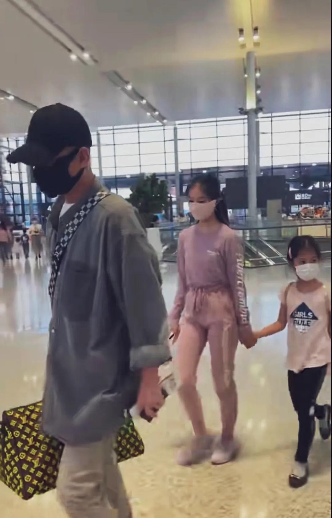 文章与两个女儿现身机场,文章身材消瘦,戴着口罩帽子,低着头走路匆匆。两个女儿手牵手跟在后面。#文章#