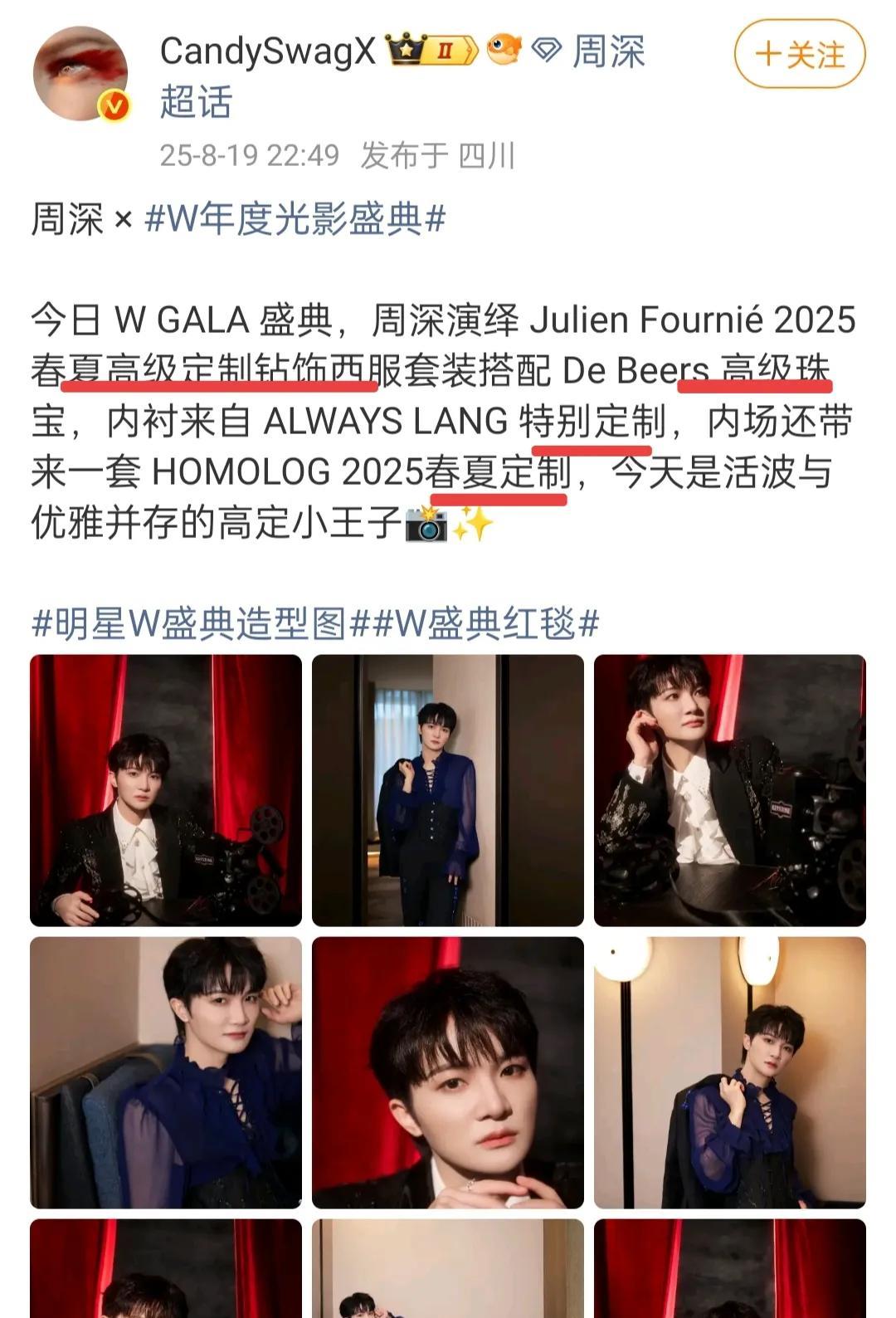 周深W盛典男星中唯一穿高定的而且全球首穿! Julien Fournié属于巴黎高定工会认证的正式会员品牌,这也是周深继去年《时尚COSMO》上身Yuima Nakazato 24春夏高定之后的个人第二套高定礼服! 而且周深今晚戴的珠宝也是顶奢,穿着高定,唱自己专辑的歌《嗨》,一镜到底的镜头,唱过房间里大部分演员主演剧的OST! 太有排面了![小鼓掌][小鼓掌][小鼓掌] #周深#