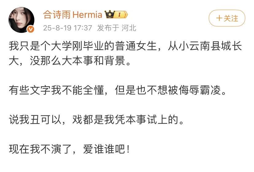 于正之前写小作文影射女演员抢角色,现在闹大了,那个被牵扯的女演员直接被剧组开除了。 事情是这样的:于正先是为自家艺人赵嘉敏抱不平,说她进组《天才女友》后,导演各种刁难,又是让她反复染发,又是凌晨试戏,最后角色被新人合诗雨顶替。 接着,于正又发了一篇虚构小故事,暗示有女演员靠不正当手段抢角色,虽然没点名,但网友猜测是合诗雨。 结果没想到,事情越闹越大,合诗雨被大家说是背景强大的资源咖,最终也被剧组换掉,合诗雨回应说自己不演了,自己只是一个刚刚大学毕业的普通女生。 于正还补刀说:“听说抵不住舆情压力被换了,挺好,演员就该经得住诋毁。” 这一波操作下来,赵嘉敏没拿回角色,合诗雨也丢了机会,看来这个角色要变成烫手山芋了,谁演都会被人嘲的。
