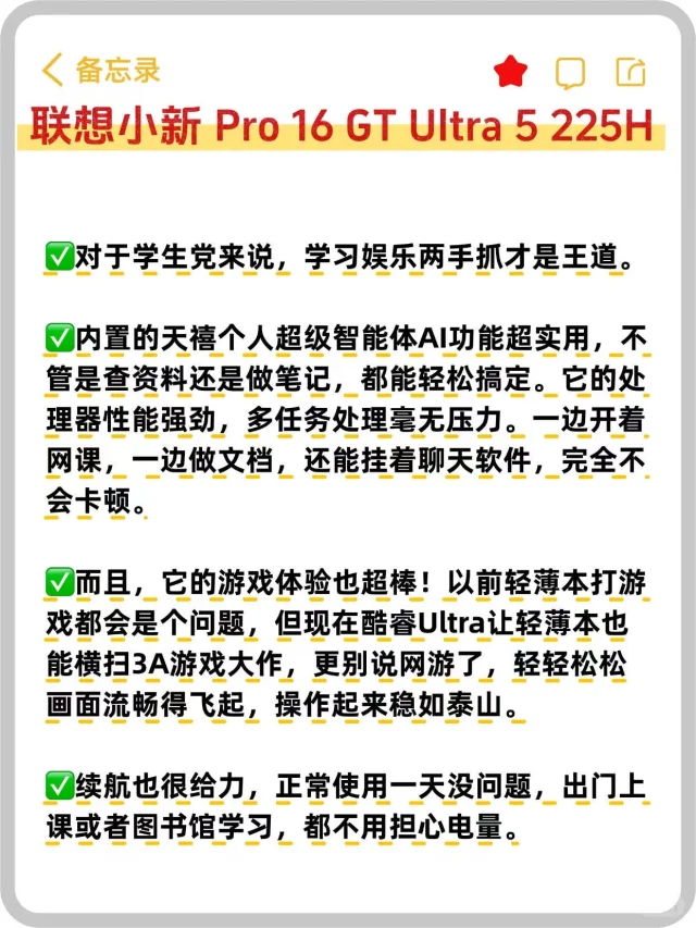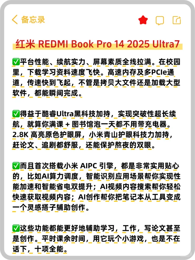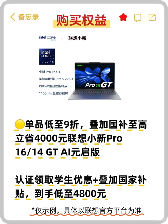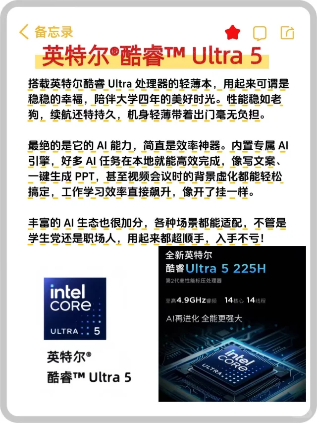 5K 价位段就能get一线AI学霸神器 三款国补 + 学生优惠后的宝藏机型 趁着京东夏日购机享国补,开学前🉑️冲 👆AI神器看酷睿 Ultra 既要轻薄到能塞进双肩包,每天带它跑教学楼不费劲;又要性能强到同时开十几个文献网页不卡顿, 处理实验数据、剪 vlog 快人一步;还要响应够快,灵感来了能立刻打开软件记录。​ 🌈而酷睿 Ultra 处理器就是 “开挂” 关键: 内置 AI 专属引擎让效率飙升x写论文时 AI 一键润色、做汇报时自动生成 PPT 版式,连视频会议都能智能虚化杂乱背景。 👍👍性能、续航、轻薄三者终于和谐共存,难怪成了学霸们的同款神器。​这波 5K 档酷睿 Ultra 本,闭眼入都不亏。 📒联想小新Pro 16 GT Ultra 5 225H 天禧AI助查资料、做笔记超实用;Ultra 5处理器强劲,开网课、做文档、挂聊天软件不卡顿。 轻薄本也有好游戏体验,酷睿Ultra能流畅运行3A大作与网游,画面稳且流畅。续航给力,正常用能撑一天,出门上课、图书馆学习无电量焦虑。 📒华硕无畏Pro15 2024(Ultra7 - 155H) 三大AI引擎助力,写论文、做PPT、玩游戏更高效。 核显强劲,剪vlog、修图快且顺;1.5kg轻便易携,大电池+闪充,满课无忧,30分钟充至50%。Ultra7处理器响应快,首字延迟不足半秒,学习、创作都能hold住。 📒红米REDMI Book Pro 14 2025 Ultra7 高速内存+多PCIe通道,传大文件、加载软件超快,校园下资料很高效。 酷睿Ultra加持续航突破,满课+泡图书馆不用充电器;2.8K护眼屏配青山护眼科技,赶论文、追剧护双眼。首搭小米AIPC引擎,AI调度、视频搜索、创作辅助等功能,助学习工作,课余小游戏也能玩。 🙆基于英特尔酷睿Ultra加持的AIPC,在能效表现上超出色。大家可以根据自己的需求选择哦‼️