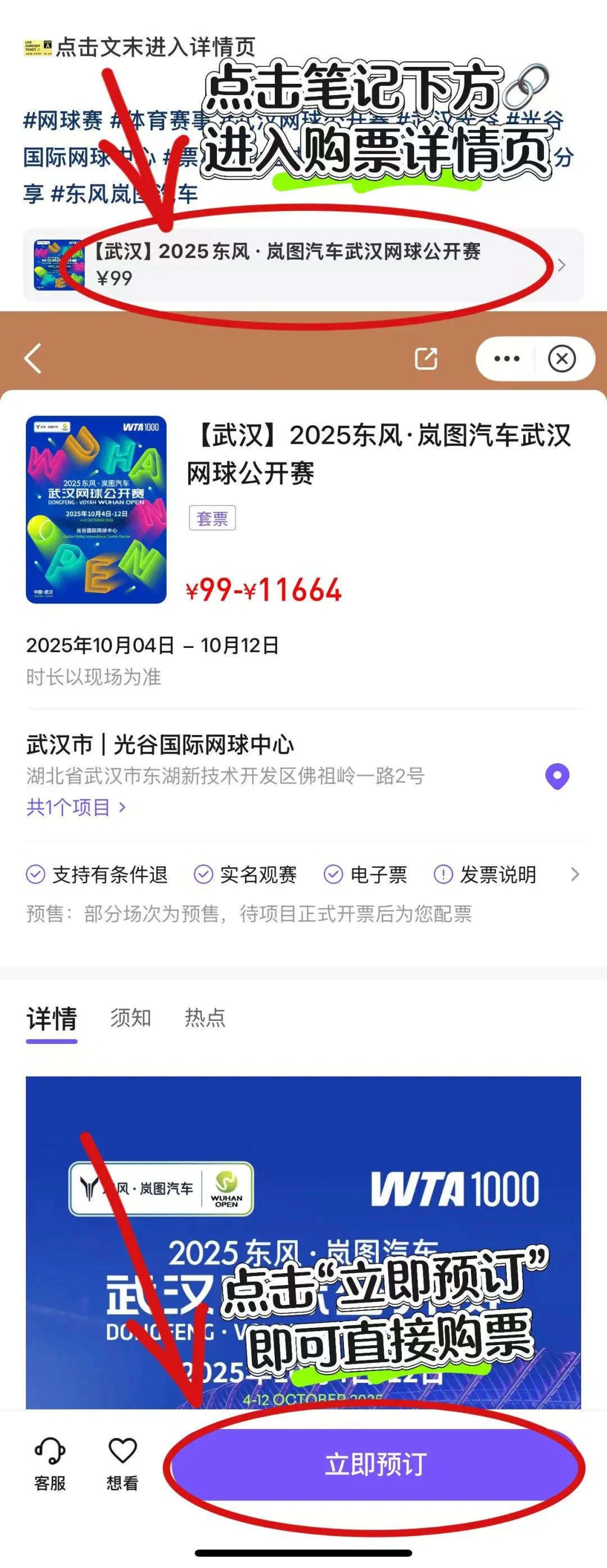 好消息!2025武网预售开启,全球顶尖女子网球选手齐聚武汉光谷,争夺高额奖金和积分~ 直接抢票超简单,点笔记下方链接就行! ⏰10.4-12日比赛,半决赛10.11周六中央球场见!