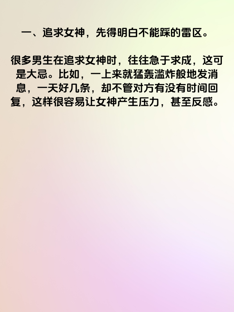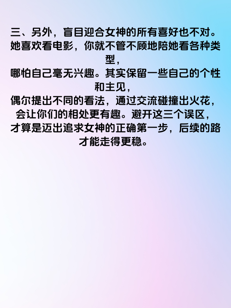 一、追求女神,先得明白不能踩的雷区。很多男生在追求女神时,往往急于求成,这可是大忌。比如一上来就猛轰滥炸般地发消息,一天好几条,却不管对方有没有时间回复,这样很容易让女神产生压力,甚至反感。 二、还有些男生,总觉得要把自己最好的一面展示出来,于是各种吹嘘自己的成就。可过度炫耀只会显得浮夸,女神反而会觉得你不踏实。真诚才是必杀技,适度展现自己的优点,同时也坦然面对自己的不足,会让你更真实可靠。 三、另外,盲目迎合女神的所有喜好也不对。她喜欢看电影,你就不管不顾地陪她看各种类型,哪怕自己毫无兴趣。其实保留一些自己的个性和主见,偶尔提出不同的看法,通过交流碰撞出火花,会让你们的相处更有趣。避开这三个误区,才算是迈出追求女神的正确第一步,后续的路才能走得更稳。