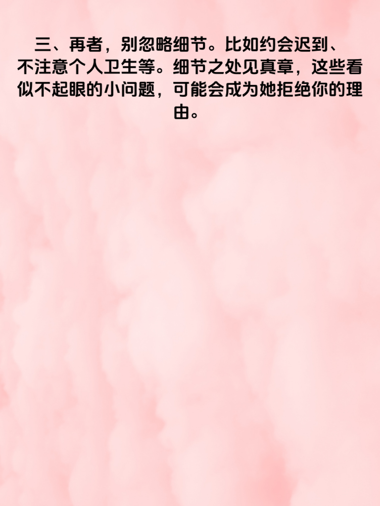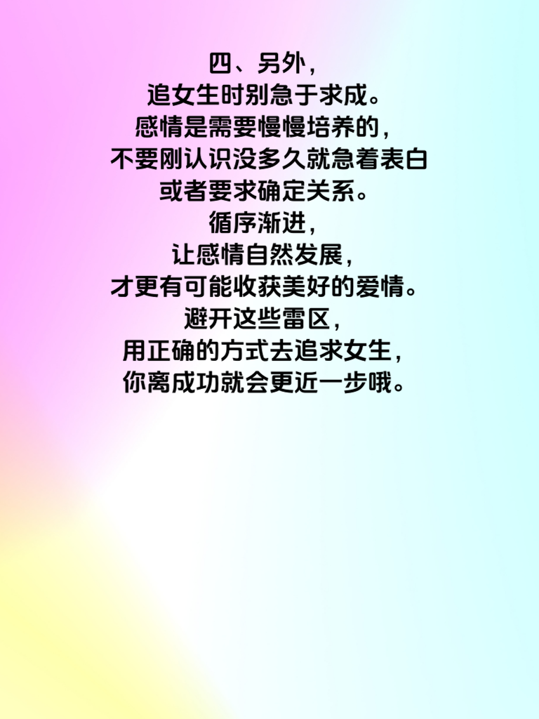 一、追女生时,有些雷区千万碰不得,否则你可能就会在感情路上吃亏啦。首先,千万别过度纠缠。当女生明确表示对你没兴趣或者很忙的时候,频繁地发消息、打电话,只会让她对你更加反感。要学会给彼此一些空间,尊重她的态度。 二、还有,别总是吹嘘自己。女生可不喜欢浮夸又爱显摆的男生。真诚才是必杀技,多聊聊生活中的小事、彼此的兴趣爱好,展现真实的自己,更容易赢得她的好感。 三、再者,别忽略细节。比如约会迟到、不注意个人卫生等。细节之处见真章,这些看似不起眼的小问题,可能会成为她拒绝你的理由。 四、另外,追女生时别急于求成。感情是需要慢慢培养的,不要刚认识没多久就急着表白或者要求确定关系。循序渐进,让感情自然发展,才更有可能收获美好的爱情。避开这些雷区,用正确的方式去追求女生,你离成功就会更近一步哦。