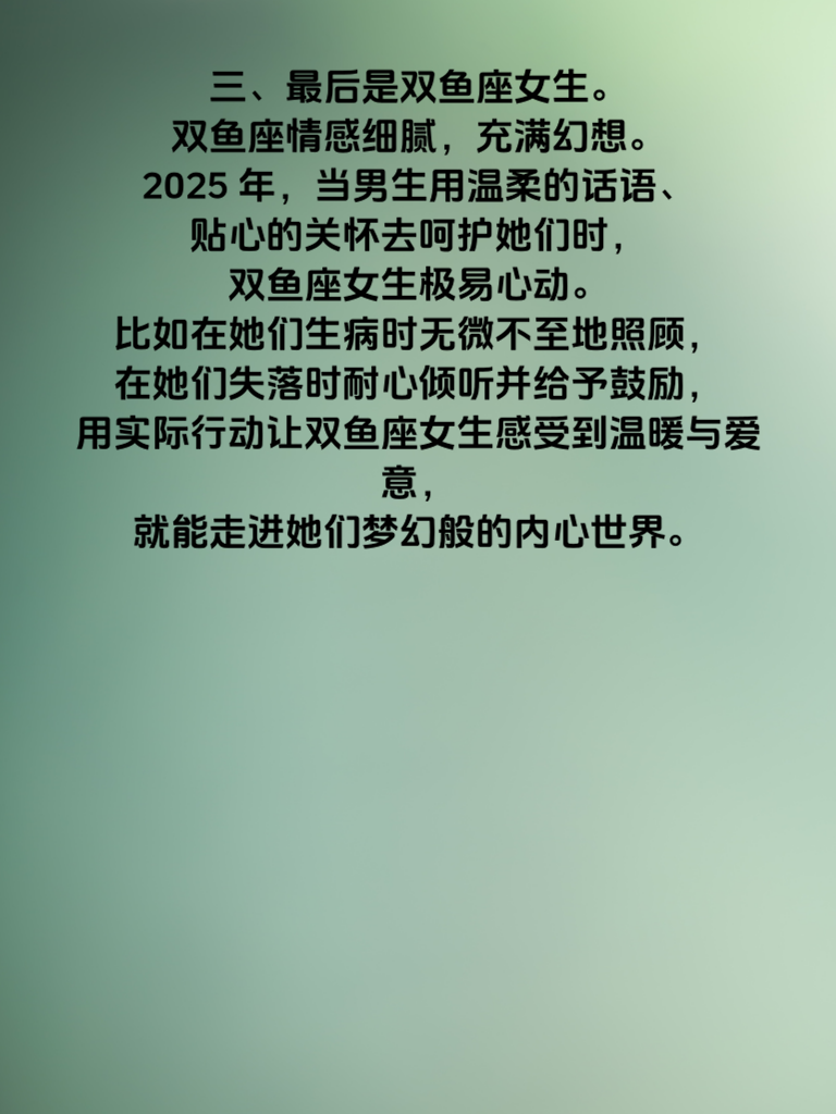 一、2025 年,哪些星座女最易心动呢?让我们一起来洞察一下。首先上榜的是白羊座女生。白羊座热情似火,她们向往充满活力与激情的生活。在 2025 年,当遇到一个能与她们一起冒险、一起疯狂的男生时,很容易心动。比如男生邀请白羊座女生去尝试刺激的户外运动,像攀岩、蹦极等,在挑战中展现出勇敢与坚韧,就极有可能走进她们的心。 二、接着是天秤座女生。天秤座注重平衡与和谐,对美好的事物有着敏锐的感知。2025 年,若有男生能营造出浪漫且优雅的氛围,比如精心准备一场烛光晚餐,在月色下翩翩起舞,或者送一份有独特品味的礼物,天秤座女生会很容易被打动,因为她们渴望那种细腻而美好的情感体验。 三、最后是双鱼座女生。双鱼座情感细腻,充满幻想。2025 年,当男生用温柔的话语、贴心的关怀去呵护她们时,双鱼座女生极易心动。比如在她们生病时无微不至地照顾,在她们失落时耐心倾听并给予鼓励,用实际行动让双鱼座女生感受到温暖与爱意,就能走进她们梦幻般的内心世界。