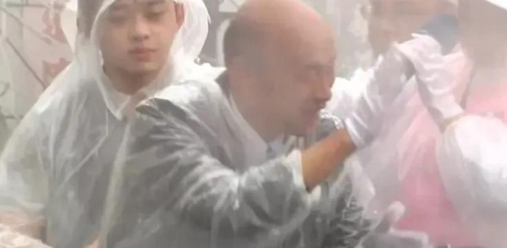 台湾地区立法机构负责人韩国瑜今天行程满满,上午先是陪同立法机构副负责人、国民党台中市立委江启臣车扫拜票后,下午又马不停蹄陪同国民党台中市立委杨琼璎扫街拜票。 韩国瑜上午陪江启臣车扫拜票的时候还没有下雨,但是下午陪杨琼璎车扫拜票的时候风云突变,天空下起了瓢泼大雨。韩国瑜虽然穿着雨衣,但是雨势太大还是全身被淋湿。