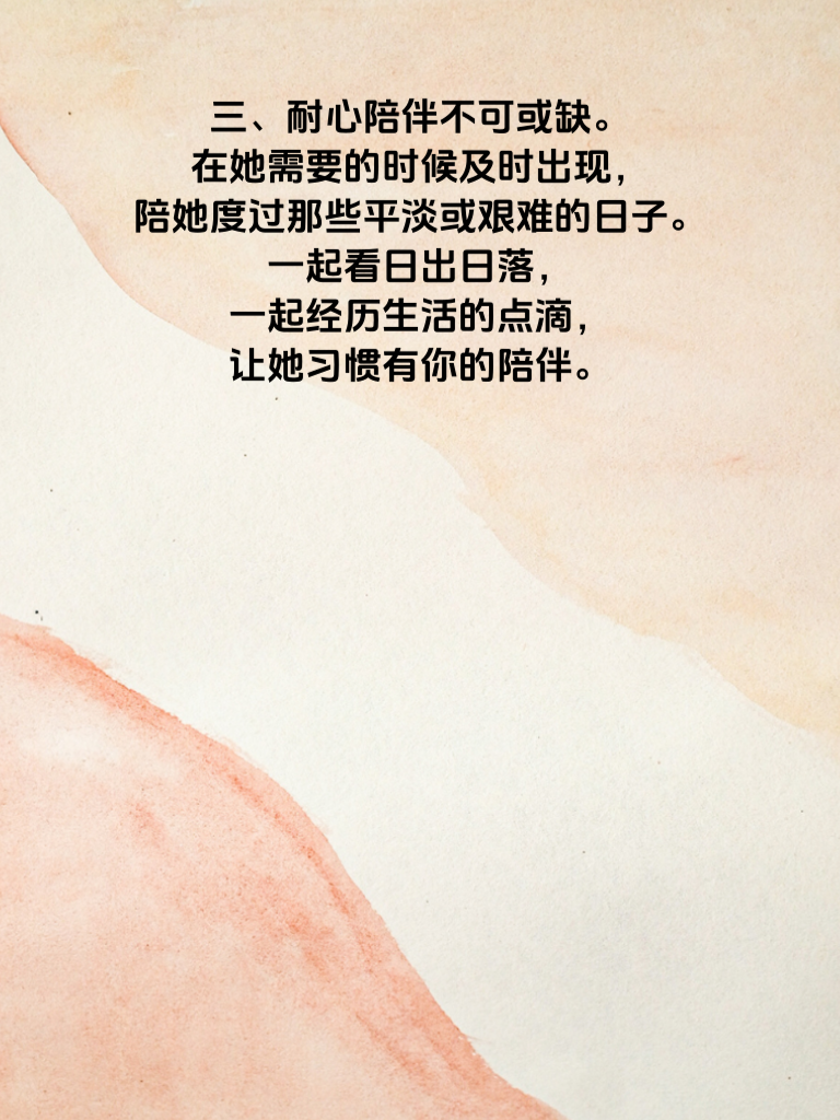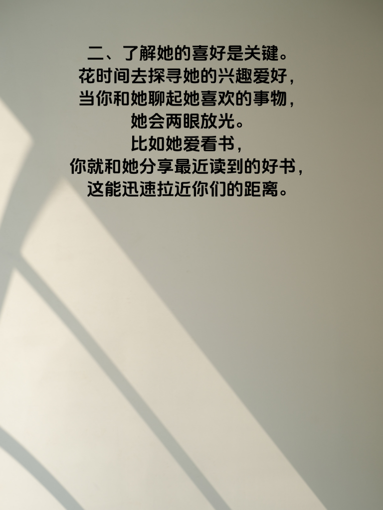 一、真心是打开她心门的钥匙。追求女生,首要的是真诚。别用套路去敷衍,用真心去感受她的喜怒哀乐。真心能让她在你面前卸下心防,感受到你的纯粹与爱意。 二、了解她的喜好是关键。花时间去探寻她的兴趣爱好,当你和她聊起她喜欢的事物,她会两眼放光。比如她爱看书,你就和她分享最近读到的好书,这能迅速拉近你们的距离。 三、耐心陪伴不可或缺。在她需要的时候及时出现,陪她度过那些平淡或艰难的日子。一起看日出日落,一起经历生活的点滴,让她习惯有你的陪伴。 四、尊重她的想法与选择。不要强行把你的观点加给她,认真倾听她的意见。尊重她的决定,哪怕你有不同看法,也以温和的方式沟通,这样她会觉得你尊重且重视她。 五、偶尔制造小惊喜。不需要多贵重,一份亲手做的小礼物,或者一次精心准备的约会,都能让她开心好久。惊喜能让她感受到你对她的用心,让爱情充满甜蜜。