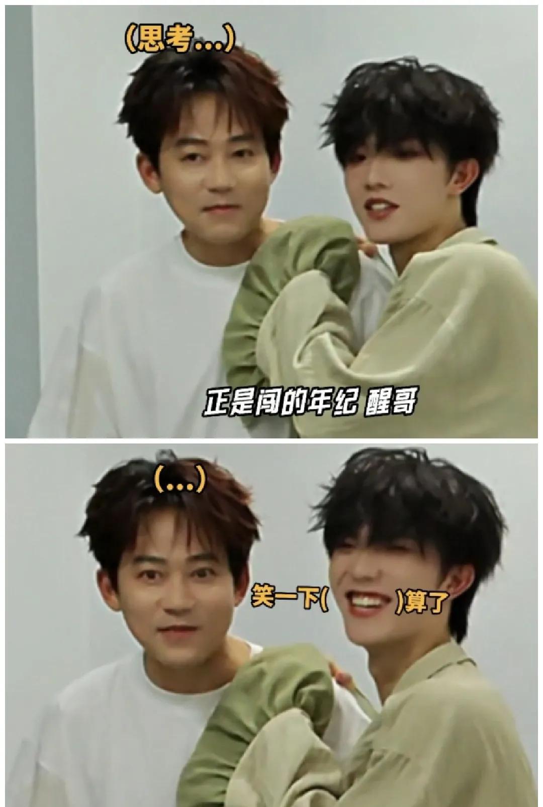 那天凌晨四点,下班的苏新皓来看上班的苏醒,苏醒:过来是看我,还是在跟我炫耀你今天可以休息了 苏新皓:正是闯的年纪醒哥 苏醒:我不开心,快点走! 最后苏醒上台前还来探班苏新皓,商量拍一张上班脸VS下班脸 哈哈哈哈哈哈哈哈哈苏醒真会整活,不放过一个素材
