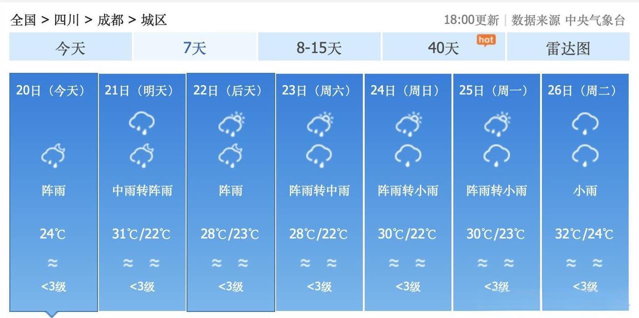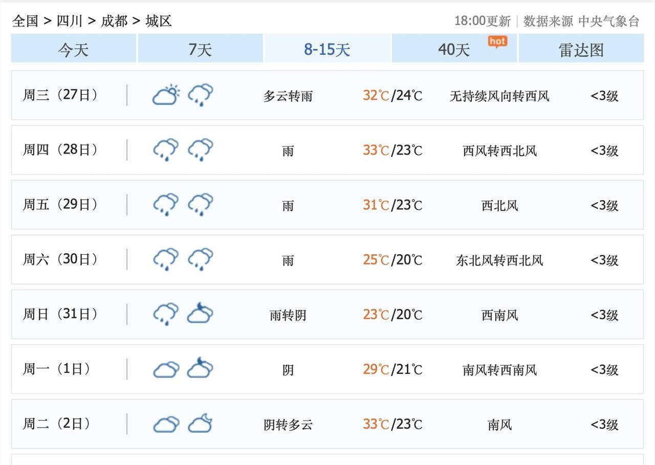 8月21日,重庆人看了看成都的天气预报,确实是羡慕嫉妒恨啊!四川省成都市,8月21日到9月3日,经常下雨,气温低迷,最高气温经常跌破30度……未来10天半个月,成都每天晚上的气温都低于25度,经常只有22度左右……成都人,接下来,空调电费将会大大节省,重庆人表示非常羡慕! 8月24日到29日,新一轮高温将会卷土重来,重庆主城区,最高气温38度39度40度……哎!秋老虎还要祸害重庆人啊! 重庆人,最近如果不想或者不能走远了,那就去成都玩几天吧!#光线摄影世界曾兰谈天说地# #头号创作者激励计划#