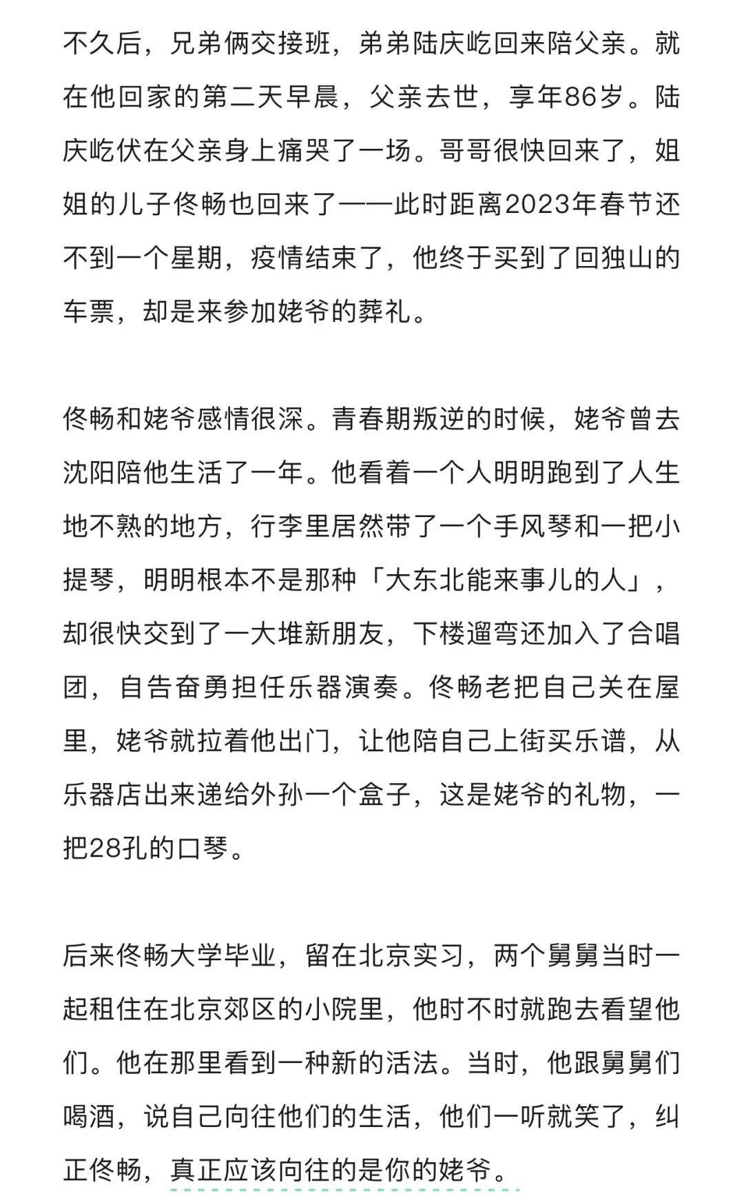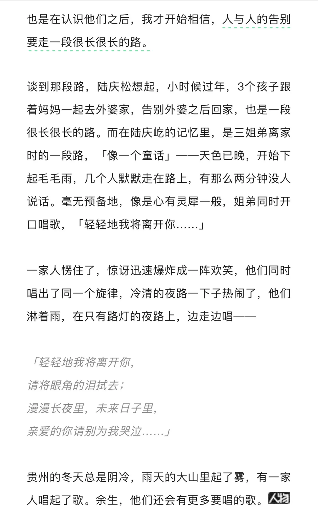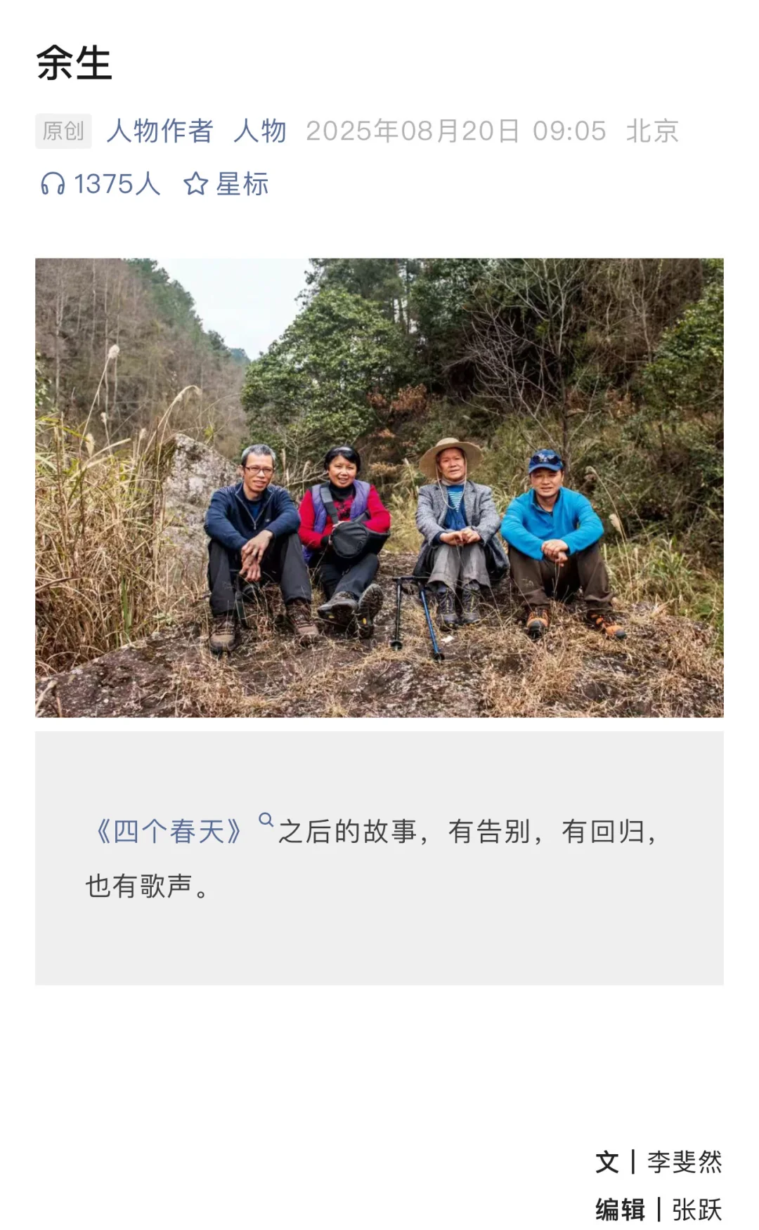 纪录片《四个春天》的故事再续,姐姐去世了,爸爸去世了,哥哥得了癌症,妈妈也去世了…贵州独山的院子再也没有欢声笑语和烟火气。 弟弟守着哥哥,外甥守着两个舅舅,他们搀扶着共度余生。一大早看得我鼻涕眼泪直流。我想这才是文字的力量和意义。