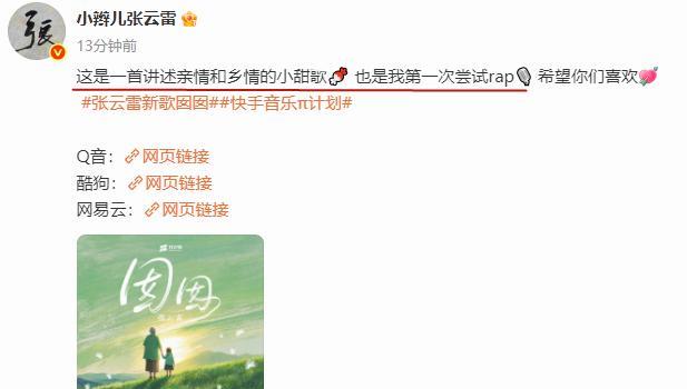 小辫儿张云雷新歌《囡囡》准点在QQ音乐、酷狗、网易云三大音乐平台上线。张云雷说道:这是一首讲述亲情和乡情的小甜歌, 也是我第一次尝试rap, 希望你们喜欢。与此同时,张云雷还分享了《囡囡》在三大音乐平台的链接。评论区中,粉丝也留下了对新歌的感受。如同张云雷之前的要求,听了,多多反馈,自己才能够更好地进步。 #张云雷新歌《囡囡》上线#
