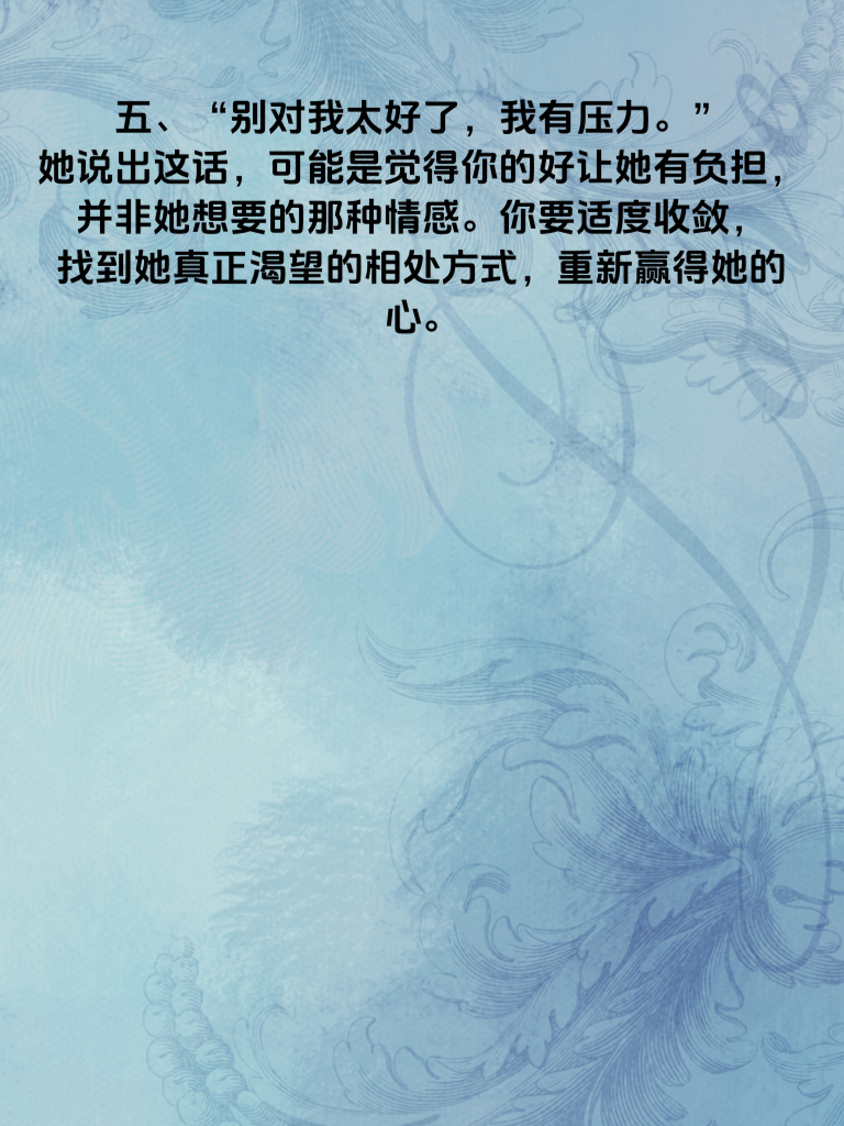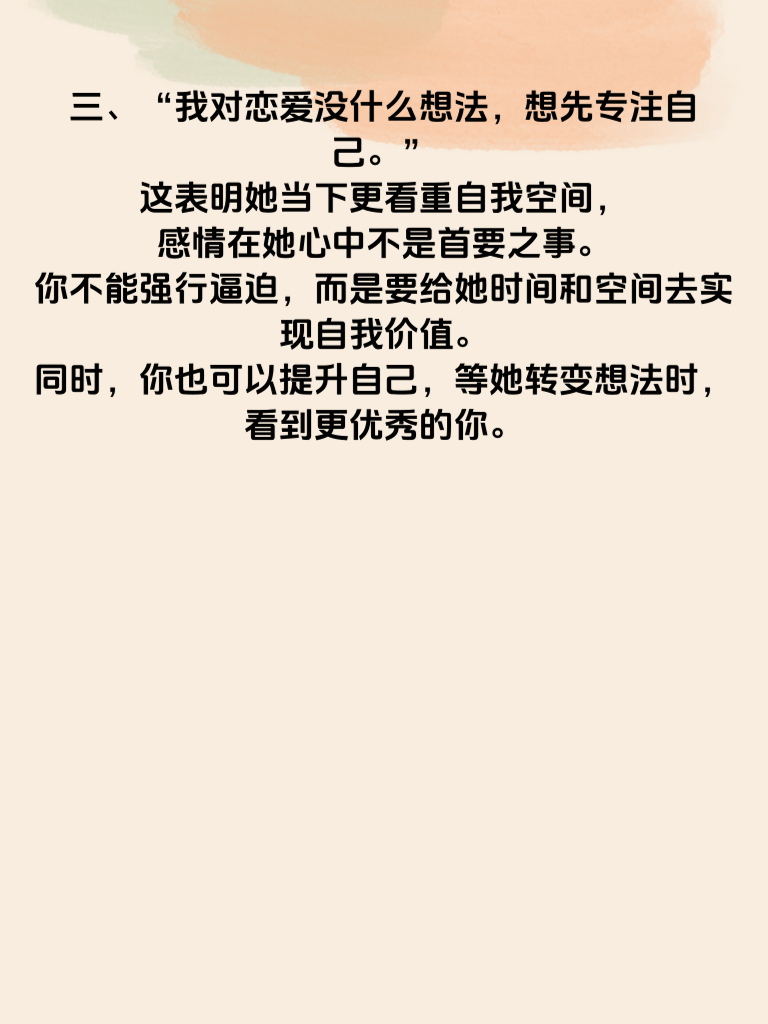 一、当女人心不在你身上时,她可能会说:“我最近很忙,没时间。”这往往是一种委婉的拒绝。她或许真的忙碌,但也可能是在刻意拉开距离。这时,你要观察她后续的态度。如果总是以忙为借口,那可能她心思已不在你这儿。你可以尝试在合适的时机,比如她相对轻松的时候,再次邀约,看她的反应。 二、“你很好,但我们不合适。”这句话看似肯定你,实则否定这段关系。她这样说,可能是经过深思熟虑。你要冷静分析原因,是不是自己某些行为或性格特点让她觉得有隔阂。可以诚恳地询问她觉得不合适的点在哪里,说不定能找到挽回的契机。 三、“我对恋爱没什么想法,想先专注自己。”这表明她当下更看重自我空间,感情在她心中不是首要之事。你不能强行逼迫,而是要给她时间和空间去实现自我价值。同时,你也可以提升自己,等她转变想法时,看到更优秀的你。 四、“我把你当朋友。”这就很明确地划定了界限。她不想再往恋爱方向发展。你要接受这个现实,调整相处模式,以朋友的身份陪伴在她身边,慢慢重新建立吸引,而不是急于求成。 五、“别对我太好了,我有压力。”她说出这话,可能是觉得你的好让她有负担,并非她想要的那种情感。你要适度收敛,找到她真正渴望的相处方式,重新赢得她的心。