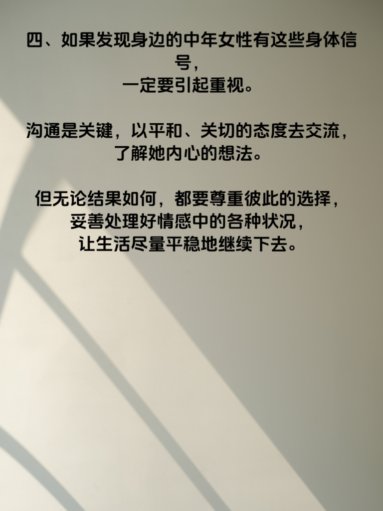 一、中年女性出轨,身体往往会发出一些信号。首先,在外表上,她可能会突然开始注重打扮,比以往更加精心地化妆、挑选衣服,仿佛回到了年轻时候渴望吸引他人目光的状态。这或许是因为她的内心有了新的期待,想要在心仪的人面前展现出最好的自己。 二、身体语言也会有所变化。她可能会不自觉地增加与特定对象的身体接触,比如轻轻触碰对方的手臂、肩膀,或者在交谈时保持比平时更近的距离。而且,她的眼神会变得更加温柔、含情脉脉,总是有意无意地看向某个人。 三、再者,她的生活习惯也会悄然改变。原本规律的作息可能被打乱,频繁有夜出的情况。可能会经常找借口加班、参加聚会,实则是为了和那个让她心动的人相处。她对自己的行踪也开始变得含糊,不再像以前那样坦诚地告知家人。 四、如果发现身边的中年女性有这些身体信号,一定要引起重视。沟通是关键,以平和、关切的态度去交流,了解她内心的想法。但无论结果如何,都要尊重彼此的选择,妥善处理好情感中的各种状况,让生活尽量平稳地继续下去。