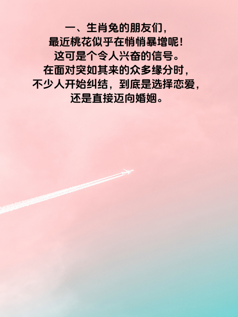 一、生肖兔的朋友们,最近桃花似乎在悄悄暴增呢!这可是个令人兴奋的信号。在面对突如其来的众多缘分时,不少人开始纠结,到底是选择恋爱,还是直接迈向婚姻。 二、恋爱,是一段充满甜蜜与探索的旅程。它能让你更深入地了解对方,享受两人世界的浪漫与温馨。在恋爱中,你们可以一起经历喜怒哀乐,慢慢磨合彼此的性格。生肖兔的你,心思细腻,在恋爱里能给予对方无微不至的关怀,收获满满的爱意。 三、而婚姻,则意味着更多的责任与承诺。它是一种稳定的关系,能给人带来归属感。当你考虑婚姻时,要更全面地审视双方的价值观、生活习惯等。生肖兔的你对待婚姻通常认真负责,若决定步入婚姻,会用心经营家庭。 四、无论选择恋爱还是婚姻,都要听从自己内心的声音。先明确自己的需求和期望,再去衡量遇到的缘分。愿生肖兔的你,能在这桃花盛开的时刻,做出最适合自己的选择,收获属于自己的幸福。