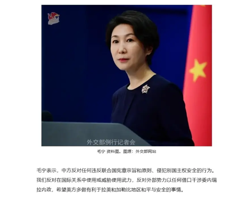 另据古巴拉美通讯社报道,委内瑞拉已经动员超过400万民兵备战美方威胁。针对这一事态,我方发言人连续使用3个“反对”表明立场,即“反对任何违反联合国宪章宗旨和原则、侵犯别国主权安全的行为;反对在国际关系中使用或威胁使用武力;反对外部势力以任何借口干涉委内瑞拉内政”,而且还直接点了美国的名,希望美方多做有利于拉美和加勒比地区和平与安全的事情。