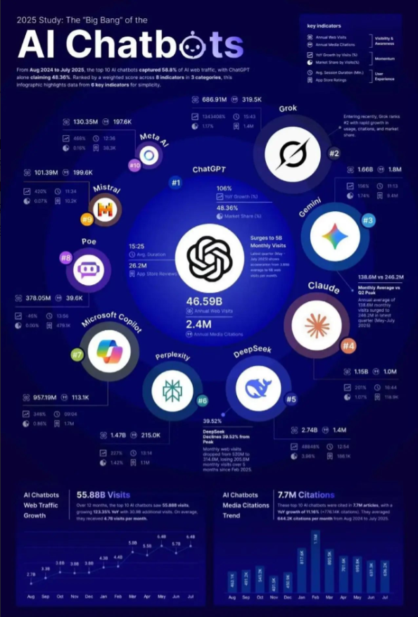 这是马斯克转发的一张图 过去12个月,全球前10大AI聊天机器人累计访问量 5588亿次,同比增长123.35%。 其中,ChatGPT 独占48.36% 市场份额,月均访问量高达50亿,继续稳居第一。 接下来的分别是Gemini,Claude和Grok。 中国的Deepseek排在第五位。 前面四个也是我目前使用最多的,Deepseek用的比较少了,国内用的比较多的反而是豆包。你呢? 我们等着Deepseek憋大招!