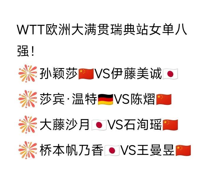 女单八强国乒占据四席! WTT欧洲大满贯瑞典站女单八强如图所示, 国乒选手莎莎、陈熠、石洵瑶、曼昱晋级女单八强。 晋级八强的日本选手有伊藤、大藤、桥本三人。 德国选手莎宾温特意外战胜陈幸同跻身八强。 比较幸运的是下一轮国乒选手没有内战,期待国乒四朵金花会师四强[奋斗]!