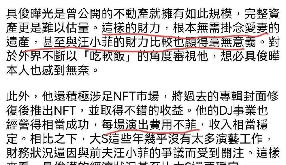 找不好对象,有要命的可能!身体不好的女人,尤其如是。更何况,一个体弱之人,还嫁给一个老光棍子。可以想想遭受的蹂躏。再加上没有营养补给,就是给吃泡面,可想而知,身体会弱到什么程度。 试想想,大S刚发病时马上飞回台湾,有可能达到救治,做为丈夫不够负责任。他冷着老脸一声不吭,照样一毛不拔。大家经常指责小s和她老妈翩翩起舞,可是,最该尽责的男人,丈夫,哪里去了? 大s病了,不陪在身边,去酒吧泡吧了,老s与小s在隔壁房间跳热舞,如果当时赶快包机送回台湾治疗,说不定还活的好好的呢? 大s又不是没有钱,现在死了,一分钱也带不走,留着老s小s及具光头还在挖空心思地争遗产呢? 连一块像样的墓地都没有,多悲哀呀? 年轻貌美都被抛弃,人老珠黄还想着重拾旧情? 大蛇真的是没有公主命,得了公主病!用所谓的爱情,来粉饰一切? 再看她们吹嘘的,电费都不舍得交的富豪,也只有湾湾人最喜爱的具女婿了。还说他有钱,有钱没钱,反正舍不得给大s花一毛钱。有钱,不是更搞笑么? 花S的钱,用孩的教育基金在韩国买房,办滨唱会画展包包店全是S的钱,戒指是纹的,住着妻子前夫啲房睡着前夫买的床垫,每天只会把尿喂饭,连死后都让妻睡2平米的大通铺,这就是有钱的主吗? 你说他没钱,就是吃软饭, 说他有钱,那就是自私,一生真爱没给对方买过一件奢侈品,住的房子还是对方的。 自己吃顿几千块的饭晒个半天,不知道哪个人设台媒觉得更好? 总而言之,言而总之,反正不掏钱。反正没给大s花过钱。反正,嫁给他三年就走了。