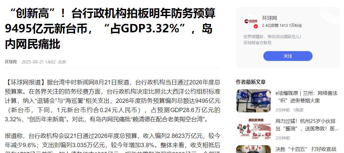 前所未有,赖当局悍然对大陆发动疯狂挑衅,这不仅是踩着红线撒野,更是在自掘坟墓,撞向 14 亿人筑起的钢铁防线! 8月21日,台湾刚曝出明年“防务”开支要飙到9495亿新台币,合着2200多亿人民币,占了当地生产总值的3.32%——这数字快追上美国了! 要知道美国养着全球几百个军事基地、11 艘核动力航母,台湾就这么个弹丸之地,砸这么多钱,不是疯了是什么? 说穿了,这些钱多半要填进美国人的腰包,台湾自己造不出像样的武器,想买先进装备全得看美国脸色。 可美国哪是真心帮它?卖的全是些过时货、二手货,还动不动坐地起价,赖清德心里门儿清,却偏要当这个冤大头,不就是想拿台湾人的血汗钱,换美国一句 “挺台” 的空话吗? 更可笑的是,它真以为砸钱就能改变两岸实力?大陆的军舰下饺子似的往海里送,五代机、高超音速导弹说列装就列装,台湾那点家底,够看吗? 别说增加这点军费,就是再翻一倍,也填补不了双方的差距,这不是扩充军备,这是往火坑里扔钱! 最让人窝火的是,台湾民生都快烂成一锅粥了,房价高得年轻人买不起,工资几十年不涨,连基本的水电供应都时不常出问题。 赖清德不管这些,反倒把本应用来改善民生的钱,拿去喂美国人,这不是祸祸台湾是什么? 它嘴上喊着 “保护台湾”,实际上是把台湾往绝路上逼,两岸真要是打起来,第一个遭殃的就是台湾老百姓。 美国远在天边,顶多卖卖武器赚黑心钱,可能派兵来吗?赖清德揣着明白装糊涂,说到底就是为了自己的政治野心,拿 2300 万台湾人的安危当赌注。 现在的台湾,就像被赖清德架在火上烤,这2200亿花出去,换不来安全,换不来尊严,只能换一堆美国的破烂和两岸越来越紧张的局势。 台湾人该醒醒了:跟着“台独”走,最后只会被卖了还帮着数钱!