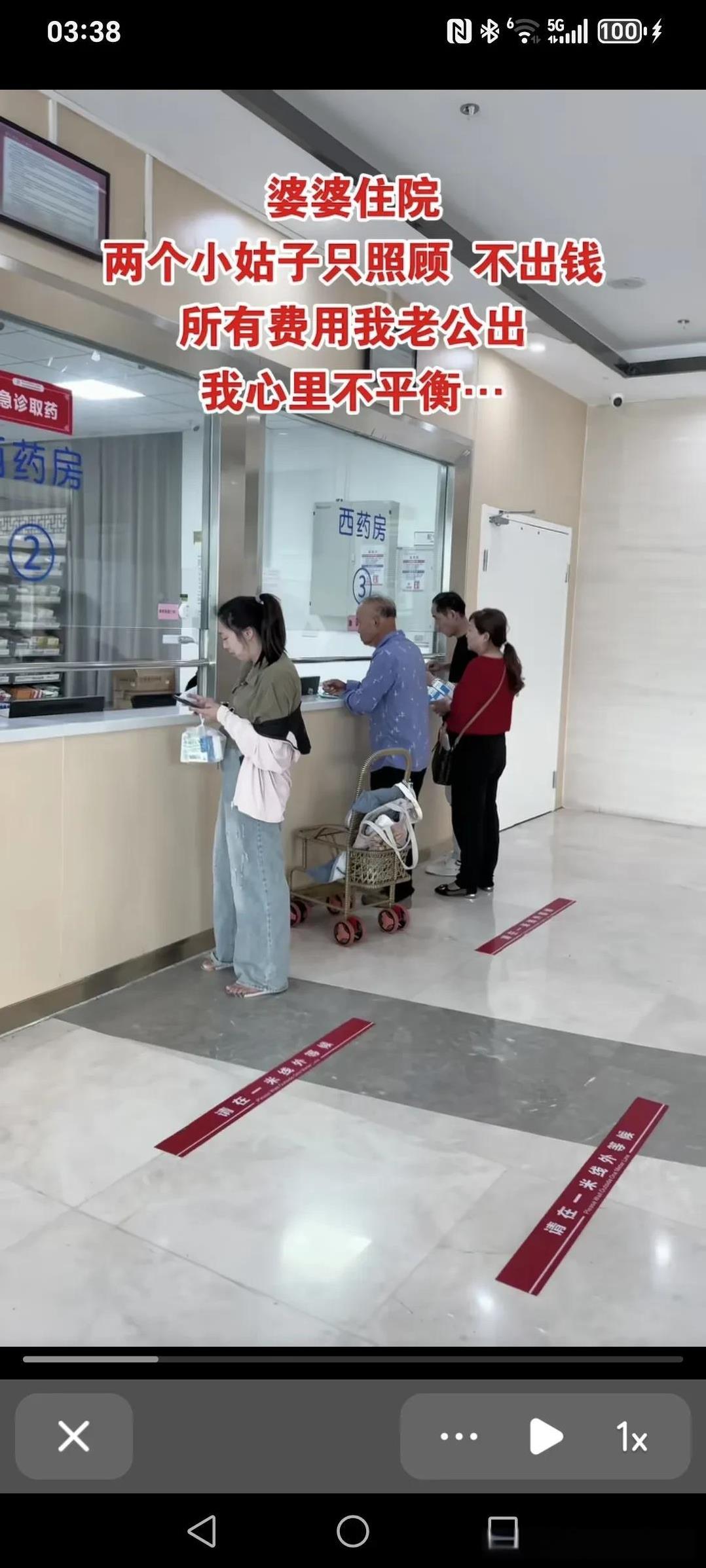 婆婆住院,两个小姑子只照顾,不出钱,所有费用由我老公出,我心里不平衡~ 这些年公婆和我们住一起,所以说衣食住行头疼脑热的费用我们全包的,因为这个我还和我老公闹别扭,这次婆婆生病住院,姑子们不拿一分医疗费?一个拿200水果钱了事,只出力照顾,这合适吗?那可是把他们拉扯大的亲娘啊。 儿子出钱是应该的,再不愿意也没办法,毕竟人家有什么也是给儿子留了不是给闺女,闺女出不出钱就看他们的心了,作为媳妇心里不平衡也不要说了,让人笑话。 女儿可根据自身经济情况而定,好了可以帮点,终究父母养我们也不容易,情况不好可以不出,时长去照顾点,探望一下[比心][比心][比心]#婆家的真实困惑# #婆家的无奈事# #婆家的烦心事#