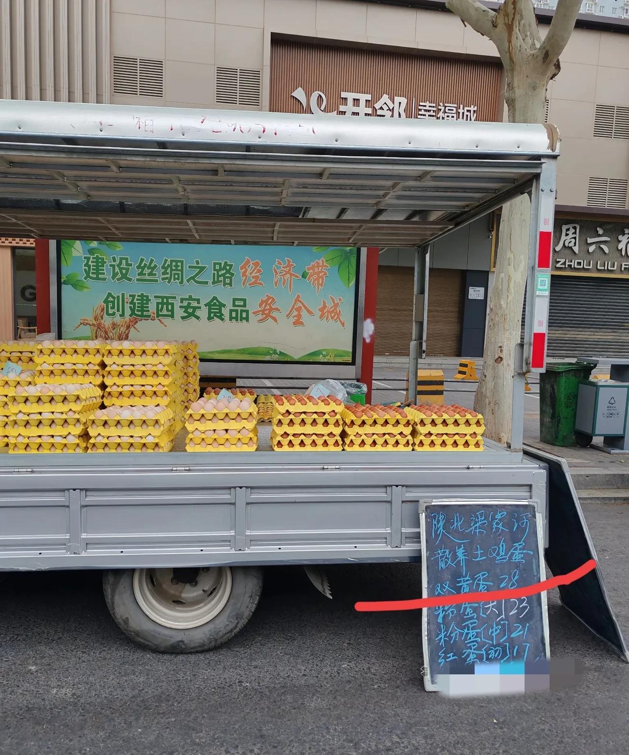 一个奇怪的发现 8月22日,今天早上我再次来城北经开区出差,路过一家肯德基店外面,发现一个流动卖鸡蛋的小摊。摊主是陕 北口音,拉着一车鸡蛋售卖,有白皮的,有粉皮的,不过今天吸引我的不是这些鸡蛋,而是他这个牌子。 牌子上醒目的写着:“陕 北梁家河散养土鸡蛋”,上面的第一项就惊到我了,他的鸡蛋按盘售卖,双黄蛋28一盘(见图2), 有点百思不解,摊主怎么确认是双黄蛋呢,我们通常买回鸡蛋打开后才知道单黄还是双黄,这个不敲开鸡蛋壳,就说是双黄蛋,是按照个头大小估算的么,还是有专业设备检测,通过蛋壳看到里面的双黄呢? 卖蛋人说双黄蛋营养好,适合老人和小孩,至于对不对不清楚,没有考证过,不过以常识判断,双黄蛋就是多了一个蛋黄,应该和普通鸡蛋营养没差别,我是这样认为的,不知道对不?