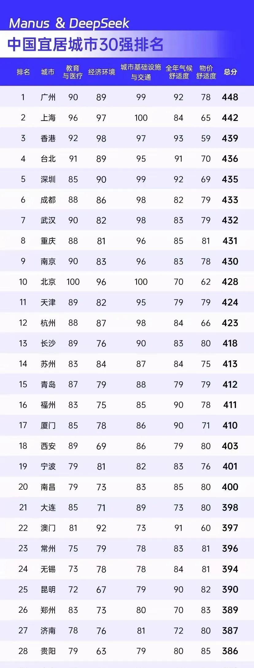 #记录我的2025#中国宜居城市30强城市排名来看:我国最宜居的城市是广州,广州力压上海成为我国最宜居城市,无论从教育医疗还是经济环境、气候舒适度等来说,广州除了物价舒适度上得分78之外,广州几乎无弱项! 与广州相比,上海主要是输在物价舒适度上,毕竟上海的物价有目共睹,当然气候舒适度上海也是输于广州不少! 从这份榜单来看明显广东以南的大城市比如广州、香港、深圳等城市得分明显高于北纬30度线上城市(比如杭州、成都、武汉、南京等) 作为浙江省会杭州由于气候舒适度和物价舒适度得分上的落后,在这份榜单之中仅仅位列第十二位,对于这份排名你们怎么看呢?