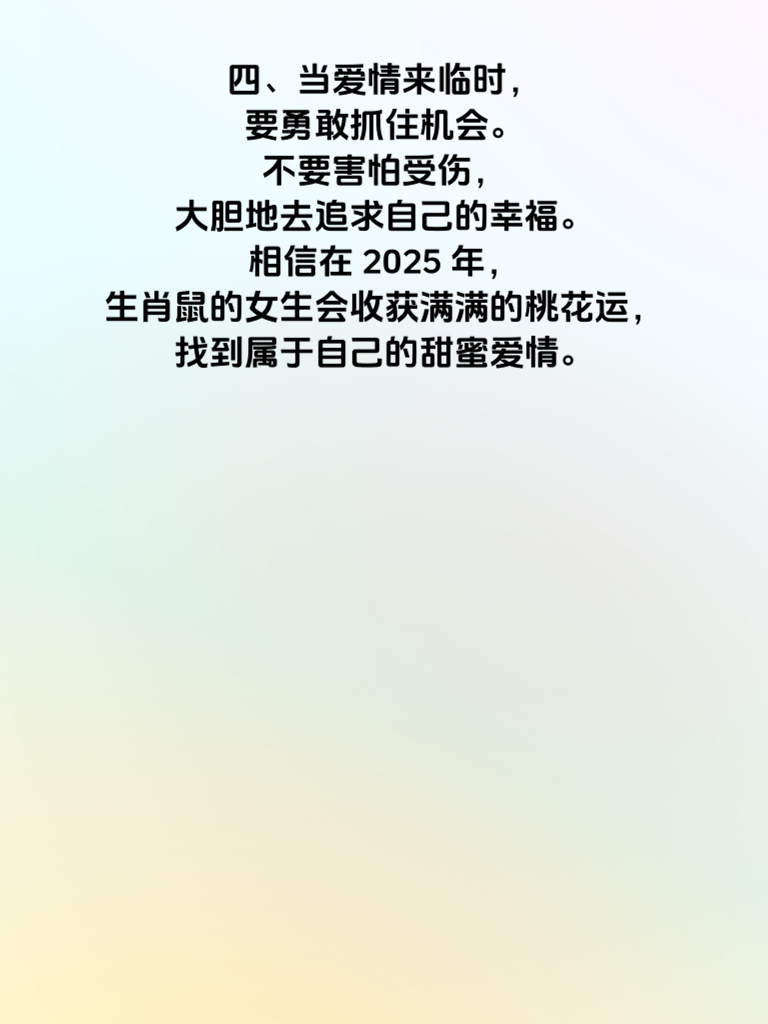 一、生肖鼠的2025年,桃花运可是备受期待呢!这一年,对于生肖鼠的女生来说,爱情或许会在不经意间悄然降临。首先,要保持自信的姿态哦。自信的你,会像一颗闪闪发光的星星,吸引他人的目光。 二、积极拓展社交圈子也很关键。走出自己的舒适区,去参加各种有趣的活动,结识新的朋友。说不定在某个转角,就能遇到那个让你心动的他。 三、展现自己独特的魅力。生肖鼠的女生聪明伶俐、古灵精怪,把这些优点充分展现出来。真诚待人,用你的温暖和善良去打动身边的人。 四、当爱情来临时,要勇敢抓住机会。不要害怕受伤,大胆地去追求自己的幸福。相信在2025年,生肖鼠的女生会收获满满的桃花运,找到属于自己的甜蜜爱情。