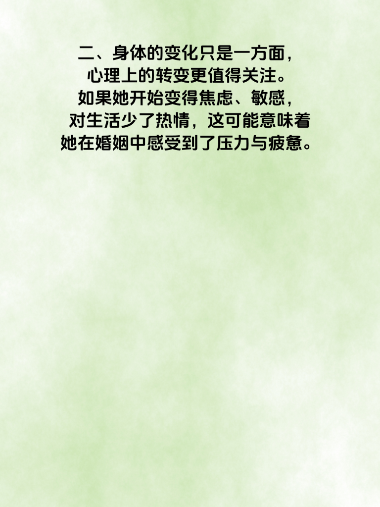 一、岁月从不留情,在女性身上悄然留下衰老的印记。当发现她的肌肤不再如往昔般紧致,眼角眉梢渐渐爬上细纹,这或许就是衰老发出的信号。而这背后,也可能潜藏着婚姻的危机。 二、身体的变化只是一方面,心理上的转变更值得关注。如果她开始变得焦虑、敏感,对生活少了热情,这可能意味着她在婚姻中感受到了压力与疲惫。 三、作为伴侣,此时绝不能忽视。要更加用心地去呵护她,倾听她内心的声音。比如,每天花些时间陪她聊天,了解她的烦恼,让她重新绽放自信的笑容。 四、婚姻是一场漫长的旅程,衰老与危机都是途中的挑战。只要双方携手应对,多些理解与关爱,就能共同走过风雨,让婚姻在岁月中愈发醇厚。