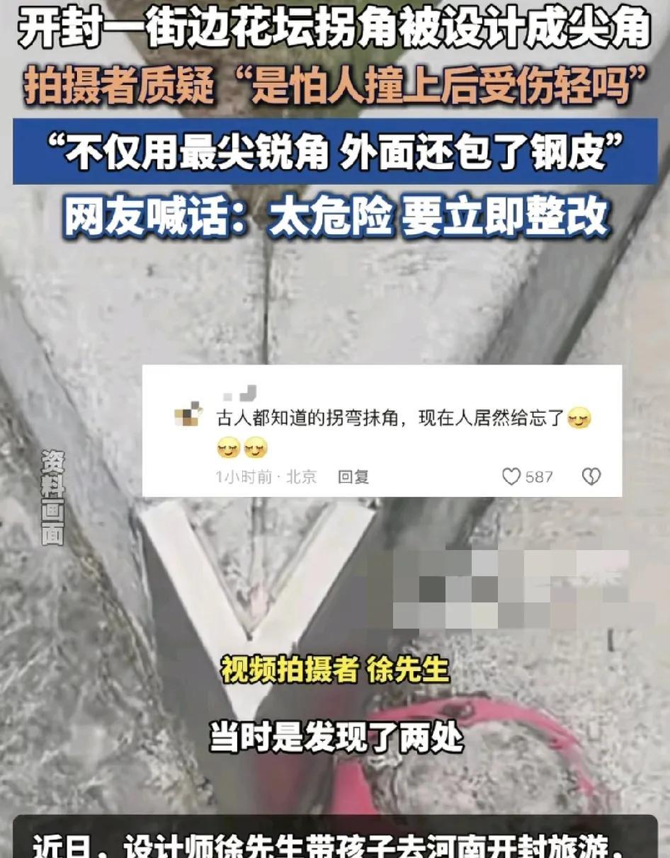 河南开封一位家长带着孩子在当地旅游,看到路边雨花池旁边的拐角处设计及其不合理。不仅设计成尖锐角,还在外面用钢皮包裹着,人一旦不小心碰上受伤都不会轻。化学设计的初心是为了保护花池的石材,但是更要考虑人们活动的安全。