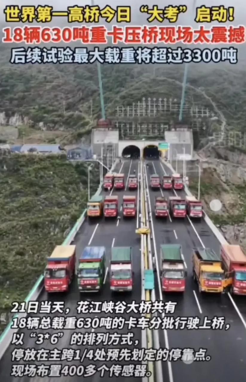 关于昨天在贵州号称世界第一高桥花江峡谷大桥上进行的18辆630吨重卡压桥试验,有网友提了两点质疑。 其一、车辆为什么都停在桥墩位置上? 其二、为什么车不是满载的? 作为一名普通的看客,我谈一下自己的理解。 科学的试验是需要循序渐进的,是由少及多、由轻及重的,第一次试验,当然是先 从最保险、最少最轻的开始啦。 相信,后续的两次试验一定会慢慢加码,释除大家的疑惑。 话说回来,一些网友的建议我觉得还是可以用来参考的。 其一、模拟一下大桥大堵车情况下的现场。 其二、施工、监理、相关审核机构负责人随车测试。 对此,大家还有什么建议呢?