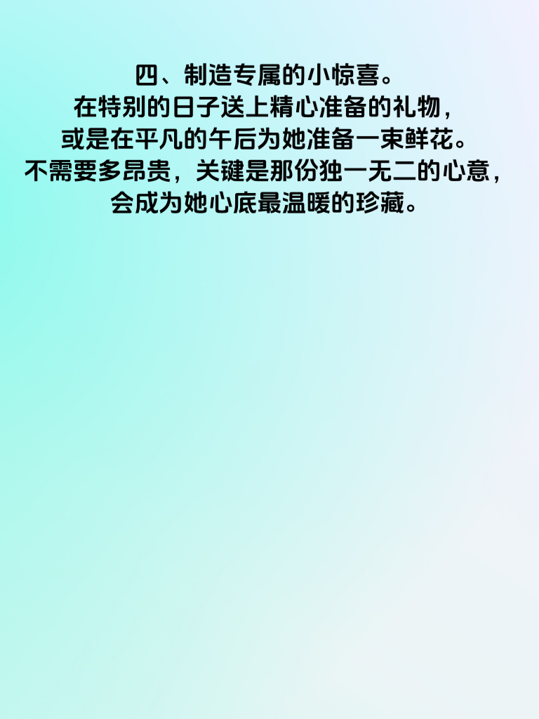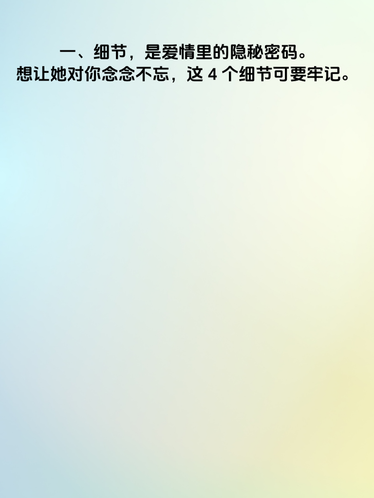 一、细节,是爱情里的隐秘密码。想让她对你念念不忘,这4个细节可要牢记。 二、用心记住她的喜好。一份合她口味的小点心,一场她期待已久的电影,都能瞬间拉近你们的距离。比如她爱喝的奶茶温度,她喜欢的书里的情节,这些看似微小的点,却能让她感受到你的在乎。 三、注重相处时的礼貌。不打断她说话,耐心倾听她的想法,尊重她的决定。一句温柔的‘请’,一个真诚的道歉,都能展现你的修养,让她在相处中如沐春风。 四、制造专属的小惊喜。在特别的日子送上精心准备的礼物,或是在平凡的午后为她准备一束鲜花。不需要多昂贵,关键是那份独一无二的心意,会成为她心底最温暖的珍藏。 五、记住这些细节,用爱去编织与她的相处时光,她定会对你念念不忘,你们的故事也将愈发美好。