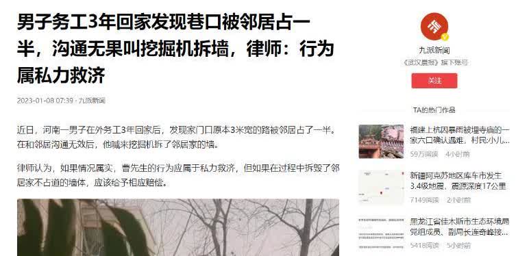 白嫖上瘾了?河南许昌,男子外出打工3年后,回到家却发现邻居趁自己不在家,把他家的院子拓宽,原本3米宽的巷子变成了1.7米。多次劝说无果后,男子大怒,当即开着挖掘机把邻居的围墙给推翻了,双方差点拼的你死我活! 老刘是河南许昌的一个农民,为了赚钱养家,他去外地打工了三年。今年一回家,他还没来得及跟老爹老妈好好亲热亲热,就发现家门口那条原本挺宽敞的巷子变得窄得要命,车都开不进去了。一问才知道,原来是邻居趁他不在家,把自家的院子扩建到了公共巷道上,巷子宽度直接少了一半。 老刘气坏了,赶紧找邻居商量,说愿意出钱让邻居把巷子恢复原样,但邻居死活不同意。老刘又去找村支书帮忙,结果还是不行。他越想越憋屈,觉得邻居占的是大家的地方,严重影响出行,可却没人能管管。一激动,第二天他就直接叫来一台挖掘机,对着邻居扩建的围墙就推。 挖掘机的轰鸣声把村民们都吸引来了,邻居也赶紧冲出来阻拦,双方差点就打起来了。这事儿很快就上了网,大家都议论纷纷。有的人觉得老刘这是“以暴制暴”,干得好;但也有人觉得他的做法太过了,应该走法律途径。 虽然有些人觉得老刘是在“伸张正义”,但从法律上讲,他这是损坏他人财产。律师说,就算是维权,也得依法来。最后,这场邻里间的矛盾还是在双方的调解下解决了,但这事儿给的教训可不小。