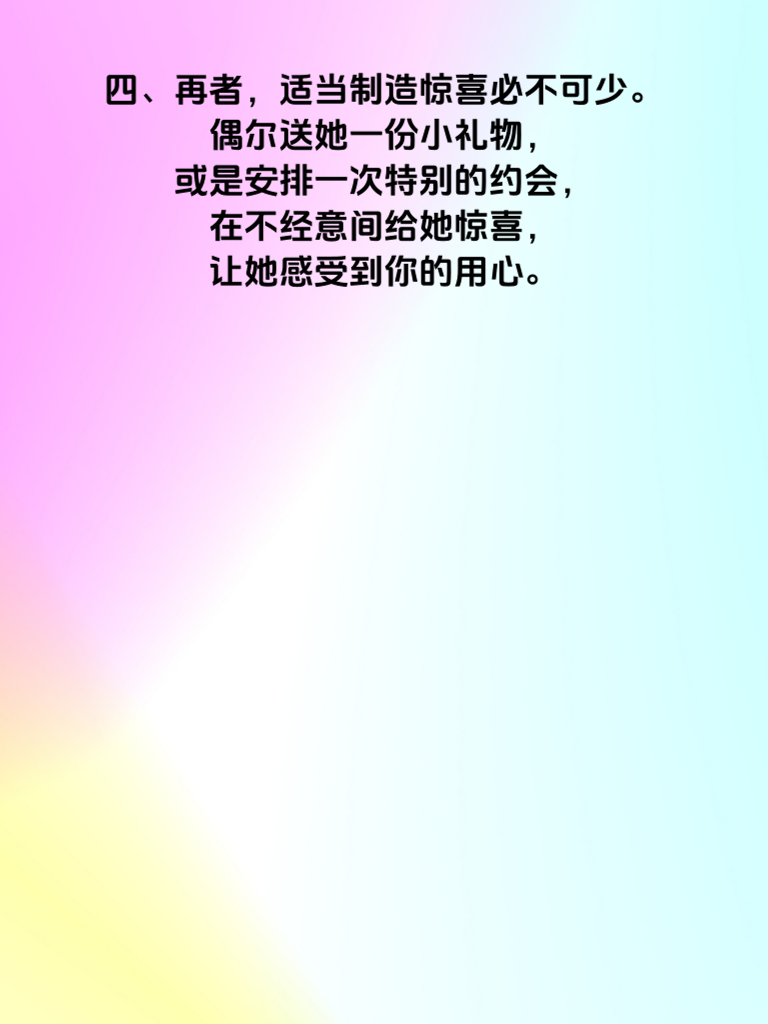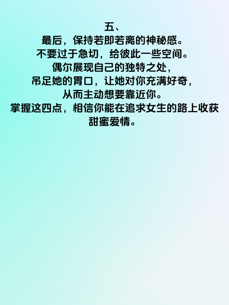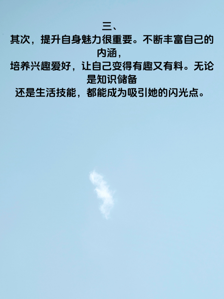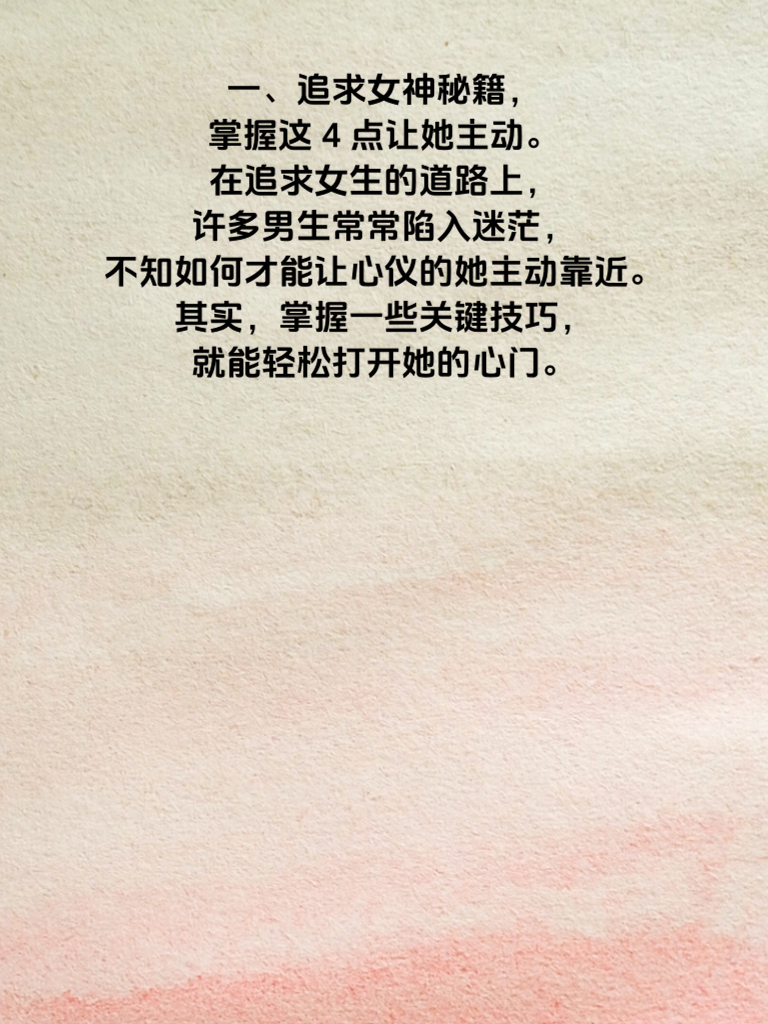 一、追求女神秘籍,掌握这4点让她主动。在追求女生的道路上,许多男生常常陷入迷茫,不知如何才能让心仪的她主动靠近。其实,掌握一些关键技巧,就能轻松打开她的心门。 二、首先,真诚是必杀技。真诚对待她,让她感受到你毫无保留的真心。分享你的喜怒哀乐,让她了解真实的你,而不是刻意伪装。 三、其次,提升自身魅力很重要。不断丰富自己的内涵,培养兴趣爱好,让自己变得有趣又有料。无论是知识储备还是生活技能,都能成为吸引她的闪光点。 四、再者,适当制造惊喜必不可少。偶尔送她一份小礼物,或是安排一次特别的约会,在不经意间给她惊喜,让她感受到你的用心。 五、最后,保持若即若离的神秘感。不要过于急切,给彼此一些空间。偶尔展现自己的独特之处,吊足她的胃口,让她对你充满好奇,从而主动想要靠近你。掌握这四点,相信你能在追求女生的路上收获甜蜜爱情。