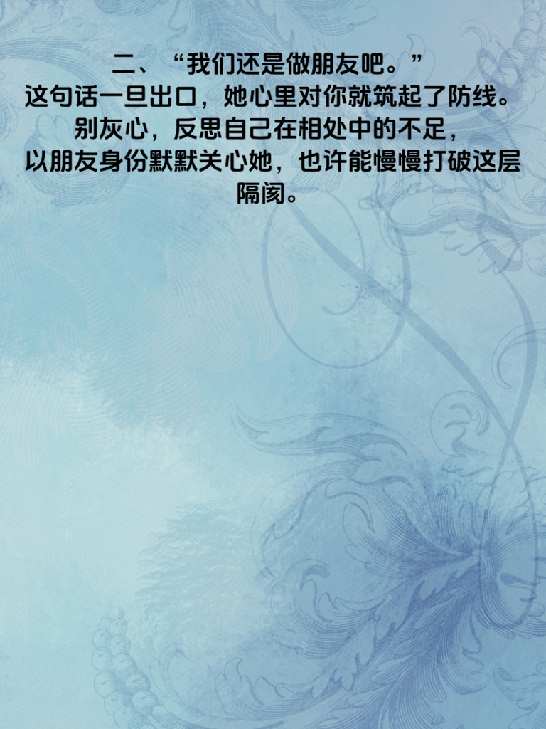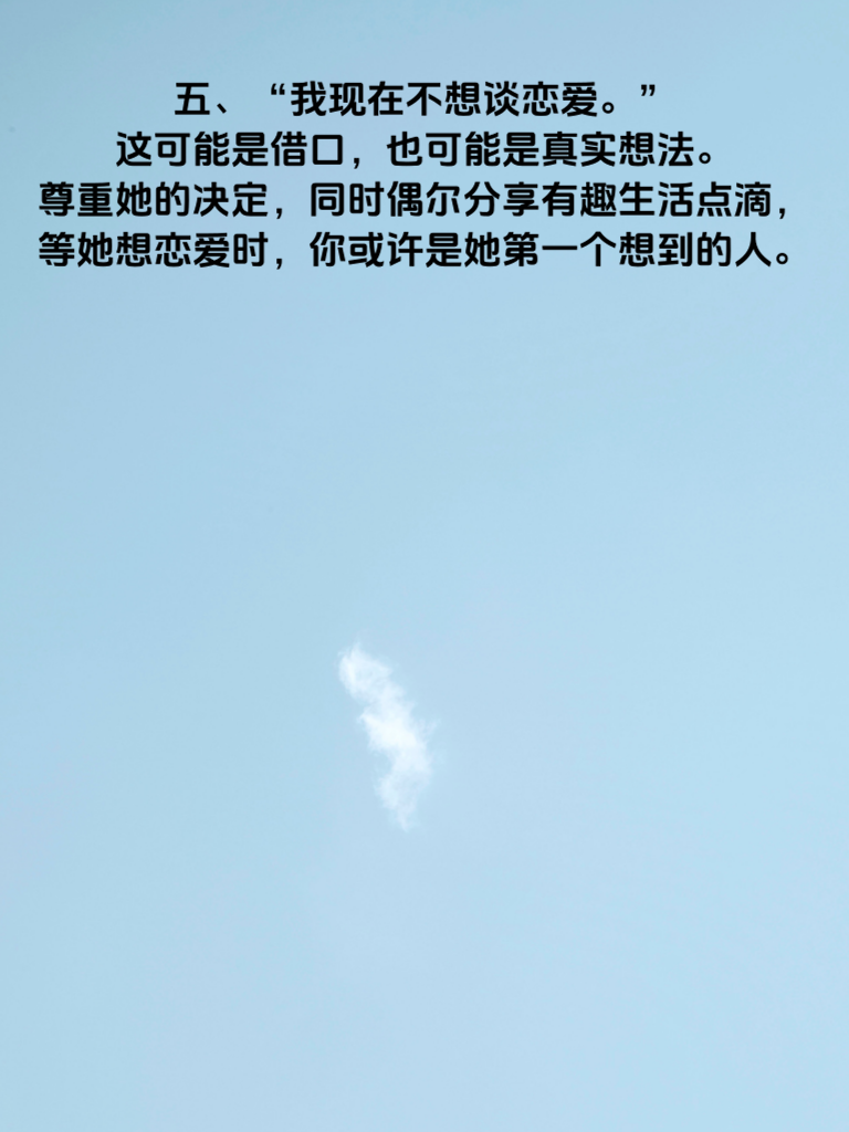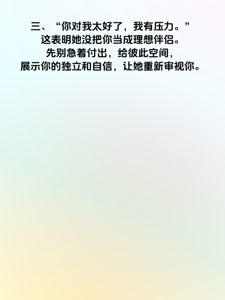 一、女人若是不爱你,常常会说:“我很忙,没时间。”她把自己的生活排得满满当当,对你的邀约总是推脱。这时候,别一味纠缠,而是提升自己,让自己的生活也精彩起来。说不定哪天她看到你的光芒,会主动靠近。 二、“我们还是做朋友吧。”这句话一旦出口,她心里对你就筑起了防线。别灰心,反思自己在相处中的不足,以朋友身份默默关心她,也许能慢慢打破这层隔阂。 三、“你对我太好了,我有压力。”这表明她没把你当成理想伴侣。先别急着付出,给彼此空间,展示你的独立和自信,让她重新审视你。 四、“我觉得我们不合适。”她已在内心否定这段关系。冷静下来,找出她觉得不合适的点,努力改变,用行动证明你能与她契合。 五、“我现在不想谈恋爱。”这可能是借口,也可能是真实想法。尊重她的决定,同时偶尔分享有趣生活点滴,等她想恋爱时,你或许是她第一个想到的人。