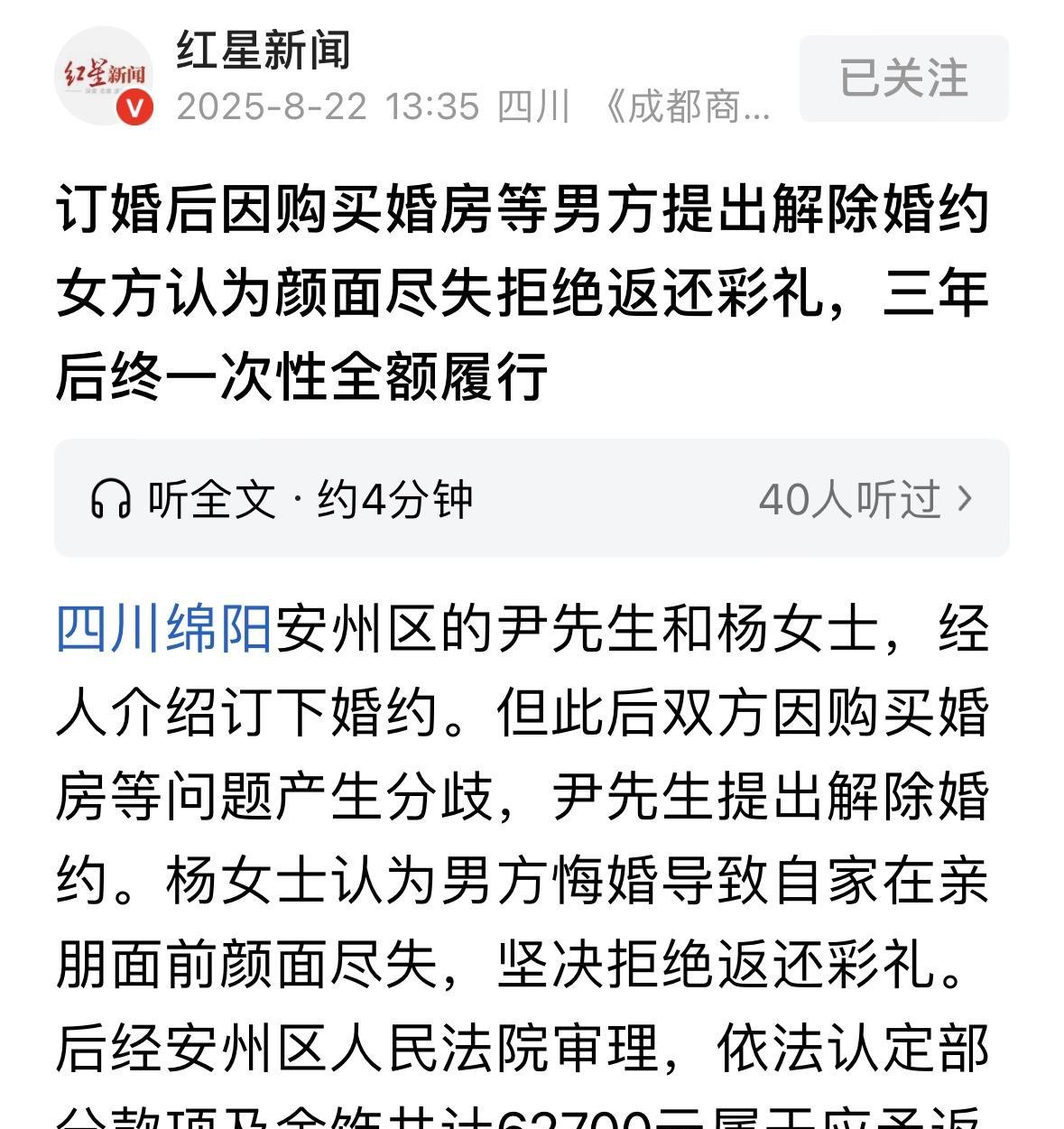 四川绵阳,男子和女友订婚后,因为买房的事有了分歧,男子看迟迟谈不拢,耐心耗尽,就要求解除婚约,让女方把彩礼全退回来,可女方家觉得,男子悔婚让他们在亲朋好友面前颜面扫地,彩礼一分都不应该退。男子没辙了,只好诉至法院,法院判女方需返还62700元,谁知判决下来后,女方一家竟跑路了,还把法院电话拉黑了… 8月22号,据红星新闻报道,3年前,尹先生和杨女士通过熟人牵线搭桥订了婚。 按照老家的习俗,尹先生家为了这门亲事,特意备了厚礼,包括一笔数额不小的现金,还有几件贵重的金首饰,就当是给女方的彩礼。 杨女士家也没含糊,摆了几桌酒席,请了亲戚朋友来见证,算是把婚事定了下来。 可谁能想到,这婚事还没办成,两家就因为买婚房等等这些事儿闹起了矛盾。 尹先生觉得杨女士家要求太多,杨女士家又觉得尹先生家不够诚意,一来二去,尹先生也不惯着,直接提出了退婚。 这退婚的消息一传开,杨女士家可炸了锅。 俩人要结婚的事亲戚朋友可都知道了,如今男方悔婚,让她们女方家的脸往哪儿搁? 杨女士一家觉得,是男方先反悔的,让自己家在村里抬不起头,这彩礼钱,说什么也不能退! 尹先生这边呢,也觉得委屈。自己家为了这门亲事花了不少钱,现在婚没结成,钱总得要回来吧? 于是,他一纸诉状把杨女士告上了法庭。 法院接了案子,仔细查了查事情的来龙去脉,又结合了当地的习俗和法律的规定,最后判定,杨女士家得把部分彩礼钱和金首饰退回来,一共是62700元。 可这判决一下来,杨女士家却不干了。 他们觉得,自己家因为这事儿丢了面子,现在还要退钱,心里实在不是滋味。 所以,判决虽然是下来了,杨女士家却一直不退钱。 尹先生等不及了,只好向法院申请强制执行。 法院这边一查,发现杨女士名下没啥财产,再一打听,原来杨女士一家早就跑到外省打工去了,连法院的电话都不接,明显是在躲着。 法院没办法,只好采取了冻结账户、列入失信名单、限制高消费这些措施。 可杨女士一家就像人间蒸发了一样,找不到人,也没钱可执行,这案子只好先搁下了。 时间一晃就是3年。 这几年里,尹先生一直惦记着那笔彩礼钱,直到2025年8月7日,事情才终于迎来转机。 那天,尹先生给法院打了个电话,说杨女士正在某医院照顾生病的母亲。 执行干警一听,立马行动起来,直奔医院。到了医院一找,还真把杨女士给找到了。 干警们跟杨女士说明了来意,杨女士一听就急了,说是男方先退婚的,到现在都让我们在亲戚面前抬不起头,凭什么还要我们还钱? 她情绪激动,死活不肯退钱。 干警们也不急,而是耐心地跟杨女士聊了起来。聊着聊着,杨女士的情绪也缓和了些,她说自己现在没工作,还得照顾母亲,实在拿不出这么多钱,想分期还。 可尹先生那边呢,坚决不同意分期,他要求一次性付清,还申请了对杨女士进行司法拘留。 干警们又试着调解,可双方就是谈不拢。 眼看着调解没戏,法院只好决定对杨女士进行司法拘留15天。 就在干警们准备带杨女士走的时候,杨女士的父母坐不住了,他们说,自己愿意代女儿一次性把钱还清。 就这样,杨女士的父母当场把7万多块钱交给了尹先生,这其中包括该退的彩礼钱、诉讼费、执行费,还有因为拖延产生的迟延履行金。 这场持续了3年的彩礼纠纷,终于画上了句号。 那么,从法律角度,怎么看待这场纠纷? 《民法典》第1042条规定:禁止包办、买卖婚姻和其他干涉婚姻自由的行为。禁止借婚姻索取财物。 尹先生家按农村习俗支付礼金及金饰的行为,属于传统婚约财产范畴。但法律明确禁止“借婚姻索取财物”,即彩礼的给付应以自愿为基础,不得以婚姻为条件强行索要。 杨女士家以“颜面受损”为由拒绝返还彩礼,实质是将婚姻与财物绑定,违背了法律对婚姻自由和财产关系的规制。 根据民法典及相关司法解释,如果双方未办理结婚登记,原则上彩礼应当返还。 杨女士一家在判决后拒不履行返还义务,甚至通过离乡躲债、拉黑法院电话等方式逃避执行,进一步构成对法律权威的挑战。 法院通过冻结账户、纳入失信名单等措施,正是对“禁止借婚姻索取财物”原则的司法维护。 《民事诉讼法》第253条规定:被执行人未按判决、裁定和其他法律文书指定的期间履行给付金钱义务的,应当加倍支付迟延履行期间的债务利息。被执行人未按判决、裁定和其他法律文书指定的期间履行其他义务的,应当支付迟延履行金。 杨女士在法院判决后长期未履行返还义务,导致尹先生无法及时收回彩礼,造成经济损失。 根据这个条款,法院有权要求杨女士支付迟延履行金。最终判决中“7万余元”包含迟延履行金,正是对这一法律规定的具体适用。 对此,你怎么看? 关注@运良说法 学法律知识不迷路 #头号创作者激励计划#