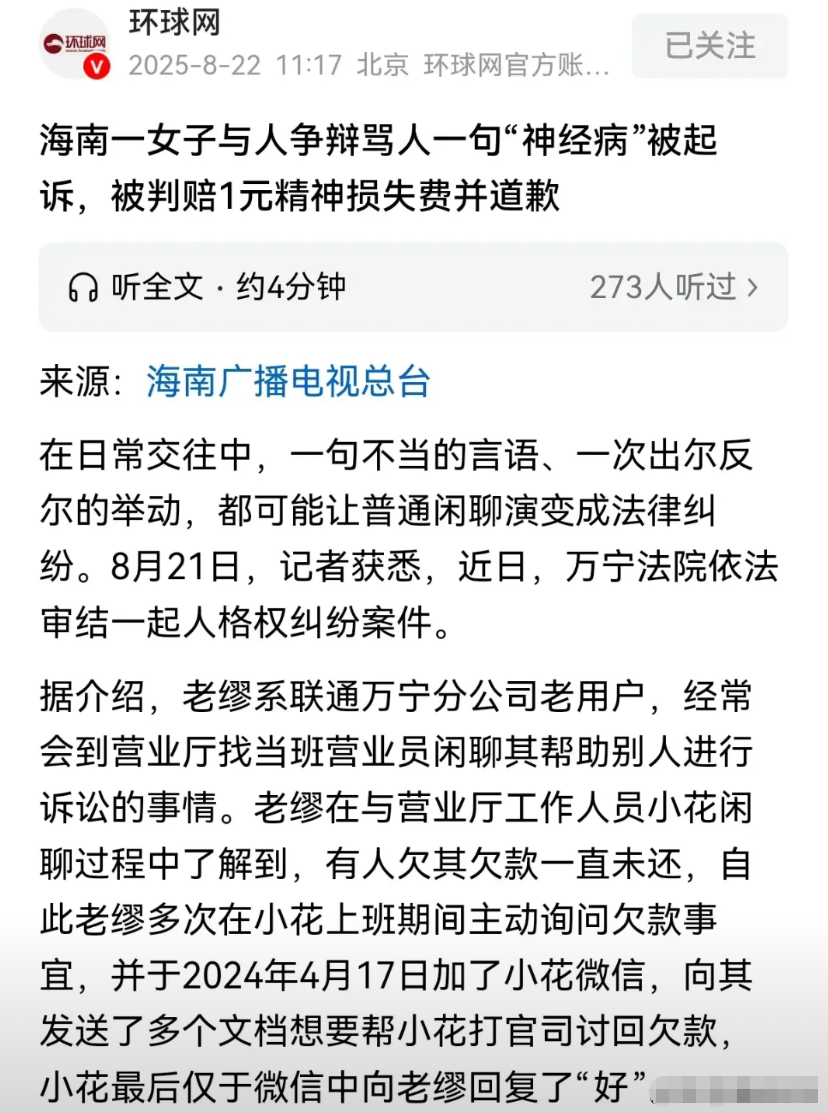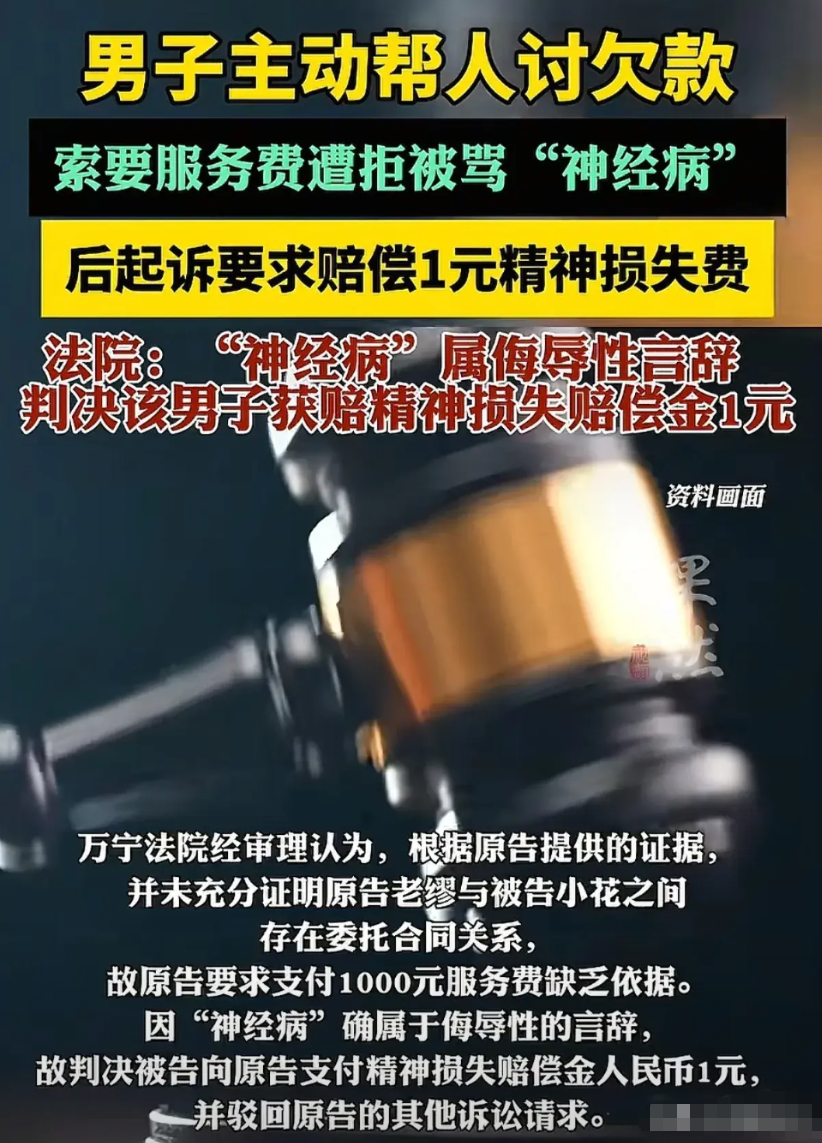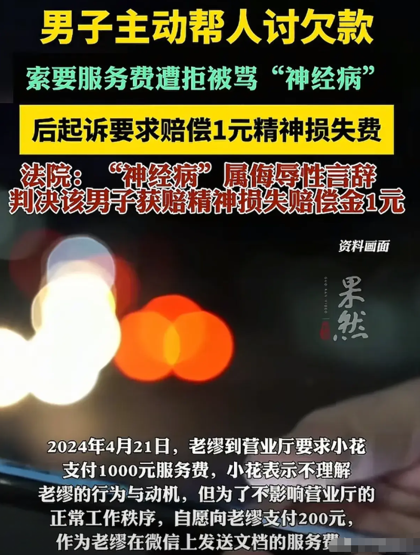 海南万宁,男子得知有人欠女子钱没还,主动说帮女子去追欠款,女子回复了一个“好”。之后男子要求女子支付1000元服务费,为了不影响工作,女子给了对方200元,双方完结此事。可没想到,次日,男子又到营业厅找到女子,要求女子给1000元服务费,女子骂了对方一句“神 经病”被告上法庭,结果让人不可思议。