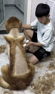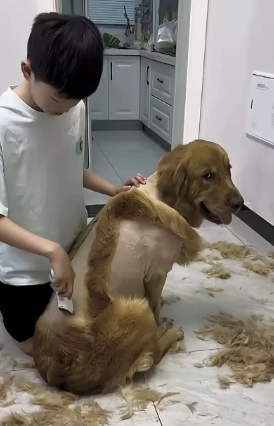 笑不活了”浙江,有一名女子晚上回家,刚推开大门,看见儿子坐在地,手里拿着丈夫平时用的电动推发剪给家里面的金毛犬剃发,而金毛犬蹲在地上,一动不动的任由小主人给它剃毛发。