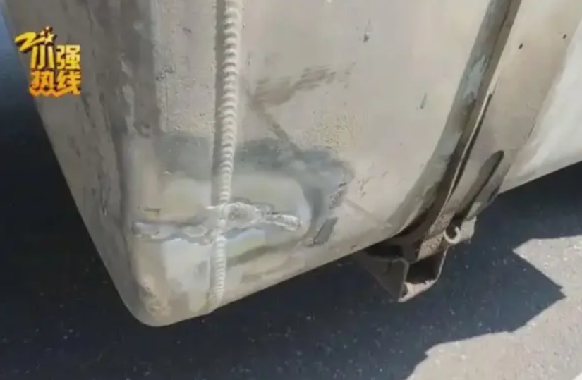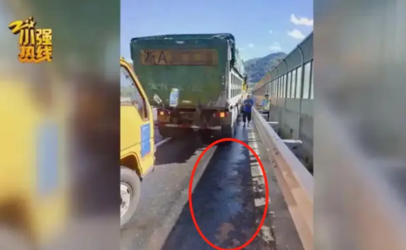 胡师傅发现车开不动了,就将车停在应急车道下车检查,一下车就看到了一条漫长的油污,果不其然,是油箱破了。