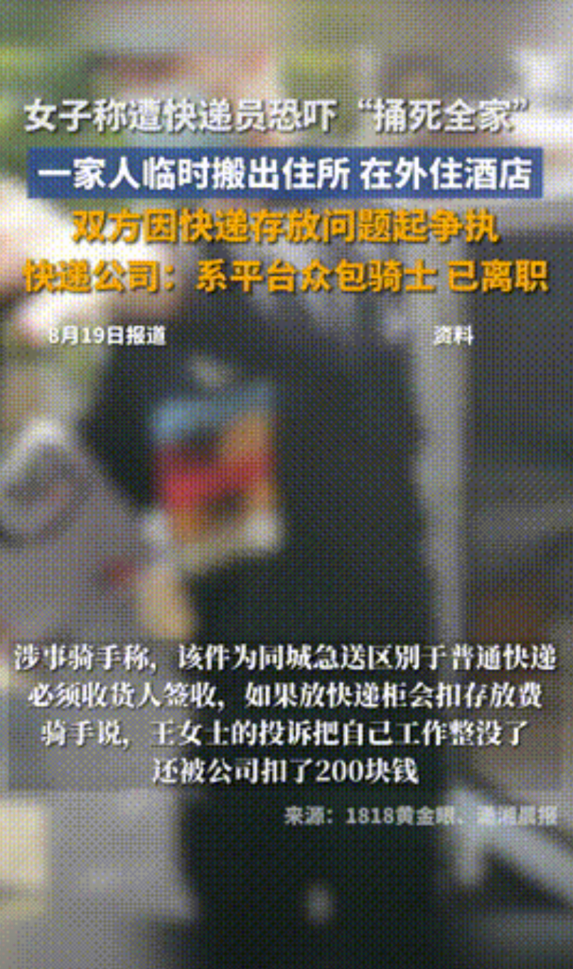 “人狂必遭灾!”杭州,一女子不在家,要求快递骑手,把文件放在快递柜里,但骑手表示必须当面签收,拒绝放快递柜柜,女子投诉后,竟接到骑手“捅死全家,一个活口不留”的恐吓电话,吓得她报警并带家人躲进酒店多日!事后快递公司回应:骑手已离职,而且是顾客先出言辱骂骑手的!