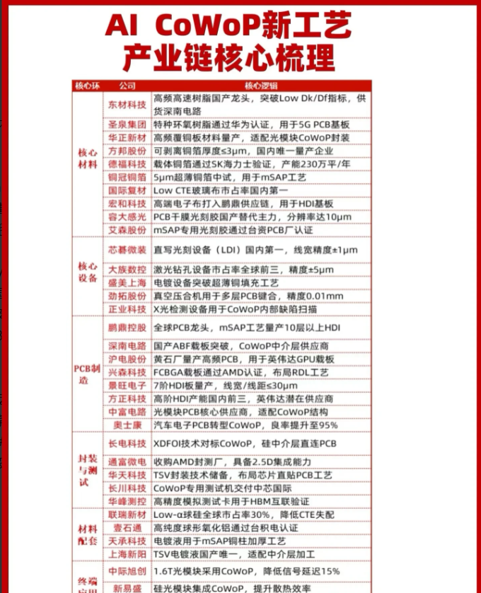 整体而言,CoWoP工艺正推动从半导体材料、设备到制造全链条的技术跃迁,为AI、自动驾驶、高速通信等领域提供核心硬件支撑。