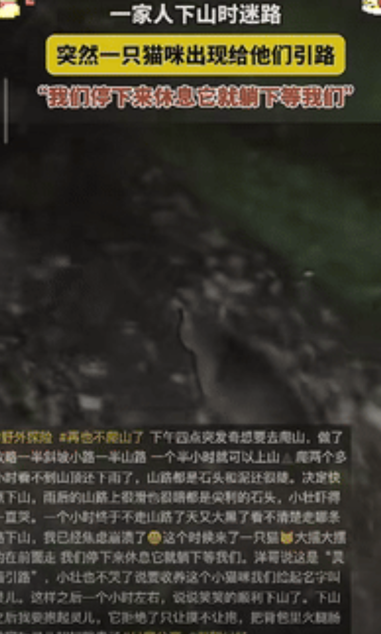 “真成精了!”黑龙江一家人爬山途中下雨了,于是就想快点下山,谁料,雨后的山路不仅滑,还有许多尖利的石头,一家人摸不准方向迷了路,就在他们崩溃之际,发现有只猫大摇大摆的往前走,他们停下休息,猫咪就躺下来等他们,下山后,一家人决定收养猫咪,可猫咪的行为,让人意外,网友:这难道是灵猫领路? 据深州融媒综合广播8月20日消息,一家人闲着没事就想着爬山,家里没什么好的娱乐设施,除了看手机就不知道干什么了,爬山不仅能锻炼身体,还能欣赏下沿途的美景。 为能顺利登顶,还特意做了攻略,于是拿着准备好的东西,浩浩荡荡的出发了,因为是临时决定,也没看天气预报,眼看天色渐渐暗了下来,他们始终没有登顶。 感觉身上被雨水打湿后,才后知后觉下雨,山上没避雨的地方,除了石子就是杂草,孩子们很是害怕,大人们不仅出声安慰,还得保护好孩子的安危。 走一段路就有个分叉口,众人一时间分不清来时路,只能凭借感觉摸索,可走了许久,发现还是在山上乱转,大人也不由得担心起来,危急时刻,猫咪出现了。 他们重燃希望,紧紧跟在猫的身后,可走了太久的山路,众人早就筋疲力尽,他们想休息会再继续前行,猫还愿意等他们,好不容易抵达平面,一家人有些劫后余生。 既然猫和他们这么有缘分,不如就养了,之后好吃好喝的供着它,结果猫还不乐意,为报答猫,他们决定拿出食物给猫吃,没想到猫咪心满意足离开了。 对于这件事情,大家有什么看法?