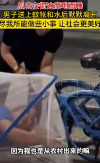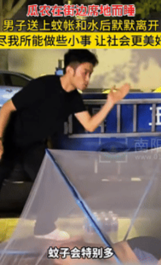 不值钱的东西这一刻也是无价之宝!郑州深夜街头,瓜农不舍得花钱席地而睡,一男子看到后直接走到他们身边,原本以为是劝告他们离开,谁知,随后男子拿出一样东西让瓜农们直接笑了。 因为自己淋过雨,所以也想要为别人撑把巨大的伞。 8月郑州的天十分炎热,夜晚的温度只增不减闷热不已。 但路边的马路上却躺着很多瓜农,因为都是直接拉了一大车西瓜从周边的农村过来,晚上也不舍得花钱住宾馆,就随便在路边凑合着睡觉。 这天晚上,小刘和朋友刚好在外边聚会结束已经很晚了,结果回家路上发现了很多躺在马路上休息的瓜农们。 看着这些年龄很大的叔叔爷爷躺在地上,小刘心里很不是滋味。 想着这几天天非常热,晚上蚊虫也很多,像这些瓜农们直接赤身裸体的躺在地上很容易被蚊虫叮咬。 随后小刘转身离开没一会又回来径直走到这些瓜农们的旁边,原来小刘和朋友去了附近超市买了很多蚊帐和矿泉水。 随后两人悄悄的把蚊帐罩在他们身上,然后默默的把矿泉水放在他们身边然后离开了。 事后小刘表示自己也是农村出来的孩子,所以很清楚这些瓜农们大老远的过来卖瓜很辛苦,自己也只是做了一件小事,只希望他们能平安健康早日卖光西瓜赚钱回家。 对此有网友也直言“这蚊帐不值钱,但这一刻在瓜农们的心里就是无价之宝。” 那么对于这件事,你有什么看法呢?
