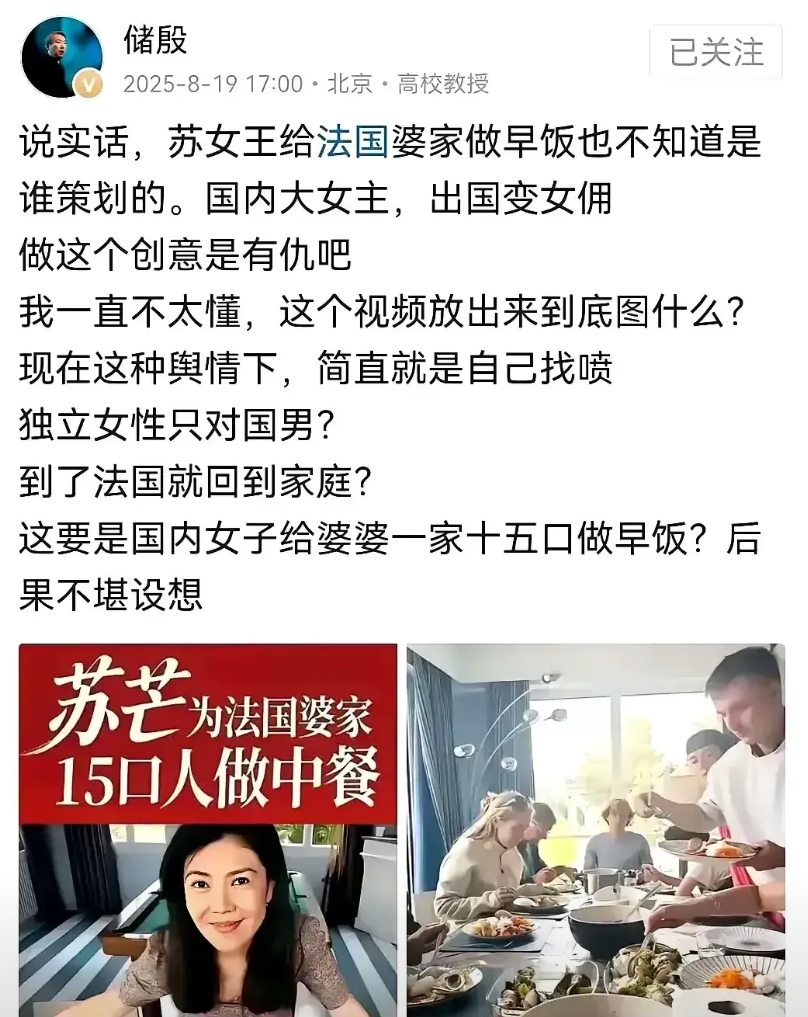储殷认为这次的外宣无疑给自己抹黑,国内大女主,国外变菲佣?独立女性只对国男,到了法国就回归家庭?这不是抽自己大嘴巴吗?这不就是换个老外丈夫跪舔吗?