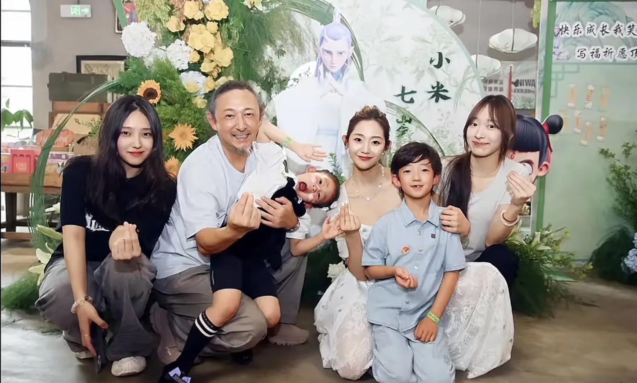 千惠跟三宝的儿子大米7岁生日拍摄的全家福里,旁边站着是三宝和前妻冯佳生的两个女儿