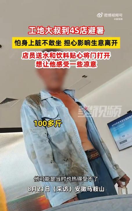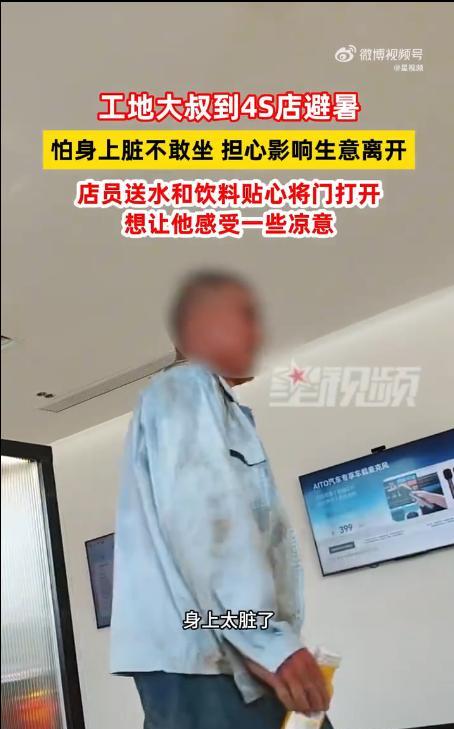 “看哭了!”8月19日,安徽马鞍山,一工地大叔中午到4S店避暑,销售小姐姐看到后,主动递上水和饮料,并让他坐下休息,可由于身上特别脏,大叔不敢坐下,还担心自己会影响人家生意,就默默离开了,小姐姐便将展厅的门打开,让大叔在门口也能吹到空调。网友:人美心善的小姐姐! 最近这几天,气温高得离谱,明明已经是秋天了,却丝毫感觉不到凉意,很多户外工作者挥汗如雨,冒着中暑的风险辛勤劳作,看着就令人心疼。 这天,李女士正在展厅里等顾客,由于中午人少,她也能稍微休息一会儿,就在这时,在附近工地干活的大叔慢慢走进展厅,打算在里面避会暑。 当天的温度高达38度,大叔抬了一上午的管子,累得面红耳赤、汗如雨下,李女士看到后急忙邀请大叔到办公室休息,还拿来水和饮料。 然而大叔只是局促的看了看周围,担心自己弄脏座椅,大叔并没有坐下,又怕影响店里的生意,便离开了展厅。 李女士看出了大叔的心思,就默默将展厅的门打开,让屋内的凉风能够吹到外面,这样多少也能让大叔凉快会儿。 网友看后表示,小姐姐真的太善良了,农民们生活不易,小姐姐不仅不嫌弃他们,还主动过来帮忙,一看就是个孝顺的孩子。 信息来源:《工人大叔到4S店避暑获暖心招待》星视频