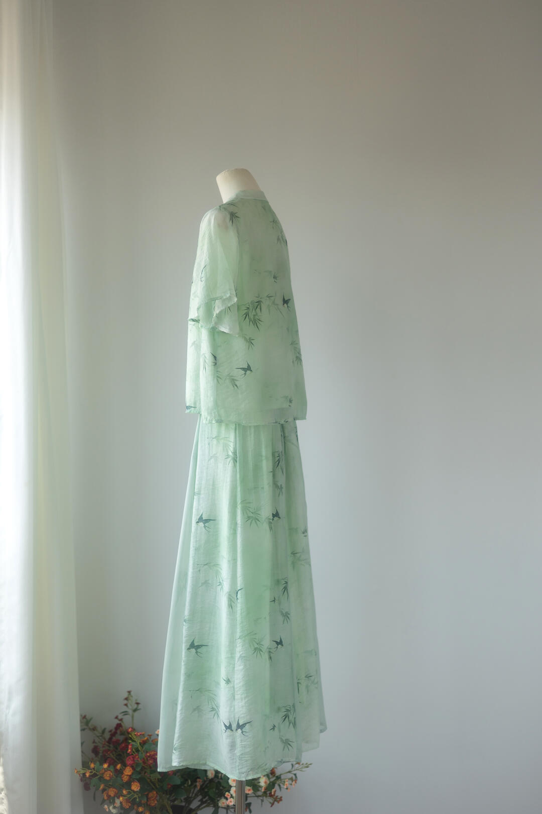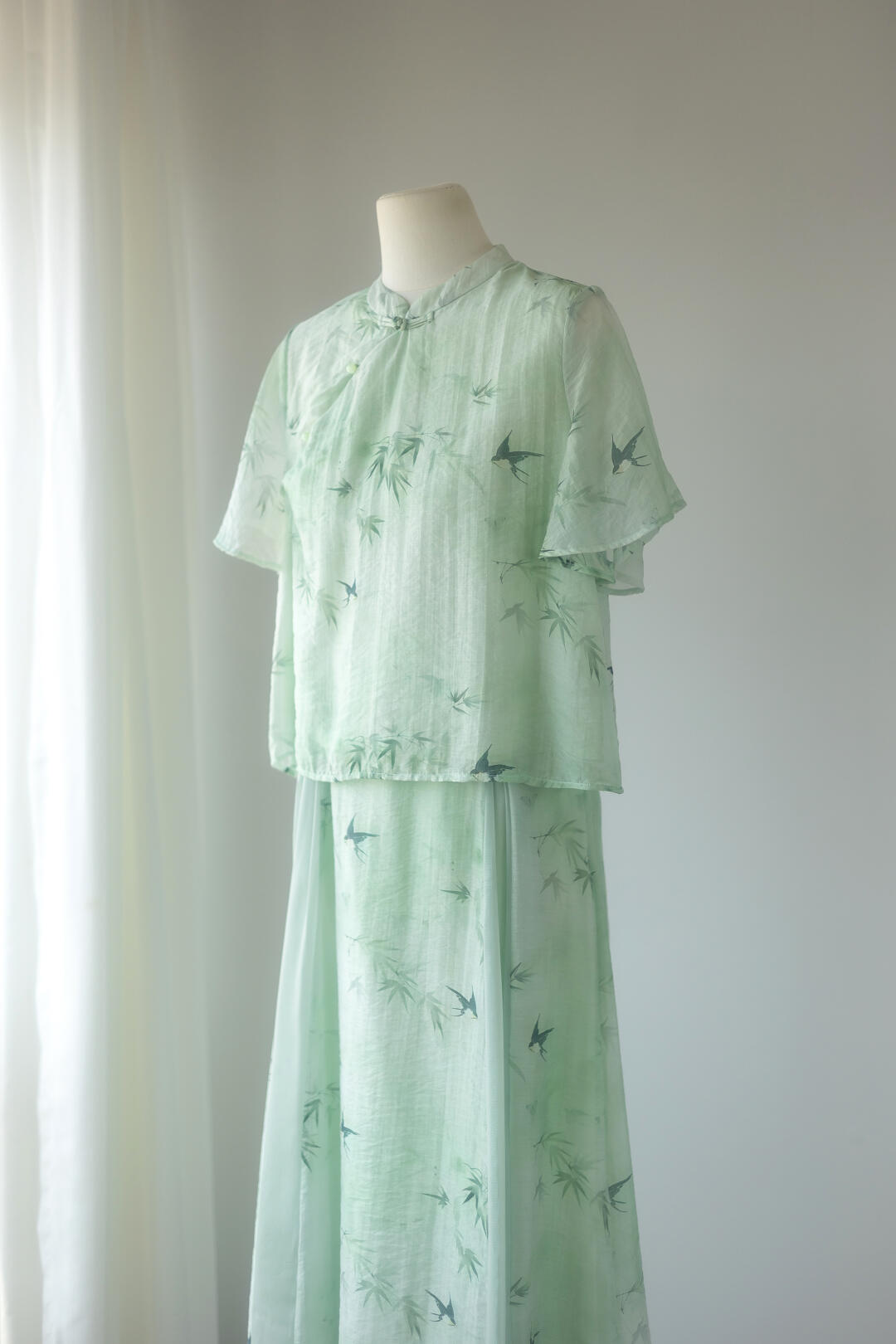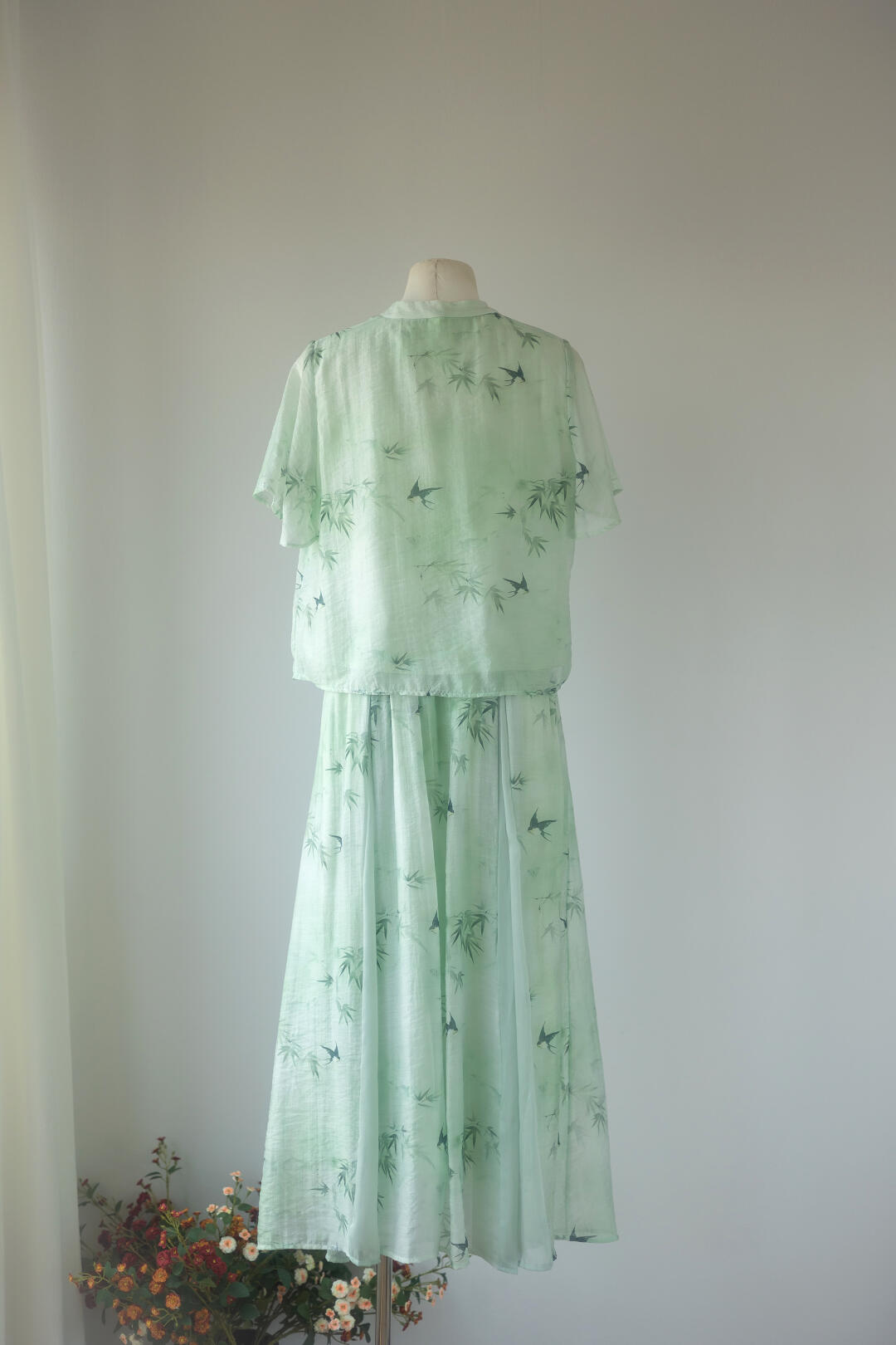 绿色同色系搭配在夏天就是视觉降温 直接变身氧气少女~ 既有端庄仪态,又有松弛感 搭配竹叶燕子图案更加治愈✨ 衣长53左右 ,裙长90cm,150cm 宽松版型,对身材包容性妥妥的~ 3️⃣码/现货库存 -